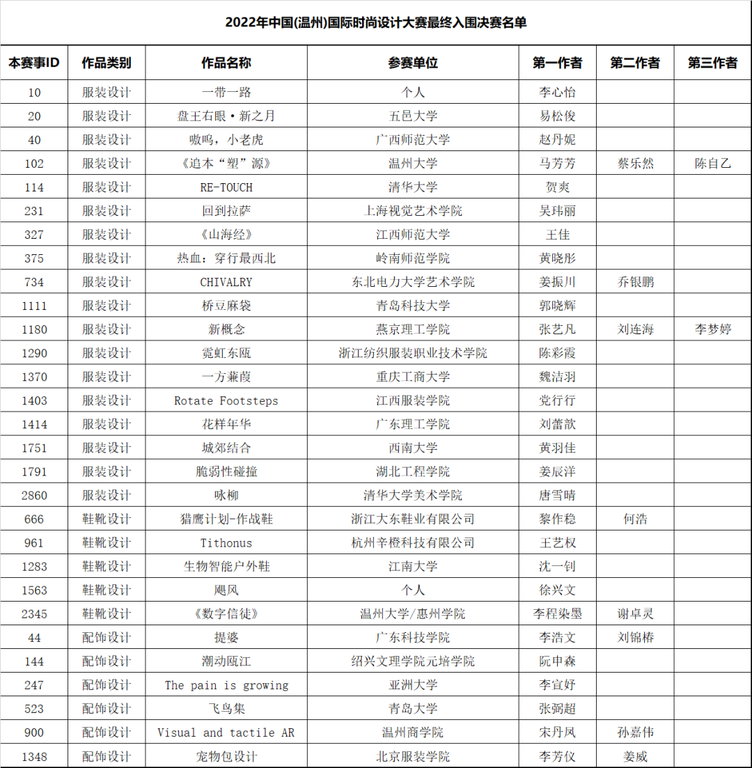 2022年中国(温州)国际时尚设计大赛,奖项设有金奖1名、银奖3名、铜奖6名、优秀奖20名,经评选出入围决赛作品(29件)。