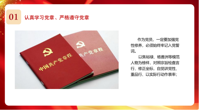 01 课程介绍 宣讲人王海燕 本次“喜迎二十大 美院微讲堂”活动由温大美院学生党员王海燕进行宣讲,带领大家学习党的十九大报告——坚定不移全面从严治党,不断提高党的执政能力和领导水平。全面从严治党是党的十八大以来党中央作出的重大战略部署,是“四个全面”战略布局的重要组成部分。全面从严治党,基础在全面,关键在严,要害在治。而全面从严治党的政治引领和政治保障使得党在革命性锻造中更加坚强,在刮骨疗毒中不断增强自身免疫力,在激浊扬清中充分彰显马克思主义政党本色,焕发出新的强大生机活力,开辟了百年大党自我革命的新境界。 02 活动方式1.活动时间 2022年10月9日 18:30-19:30 2.活动地点 2b236 03 课程回顾 什么是“全面从严治党”? 从严: 1.要求从严,措施从严,查处从严。坚持言必信、行必果,认认真真管,实实在在严。 2.坚持问题导向,从细处入手,向实处着力。 3.加强舆论监督,注重对比宣传,既发挥先进典型示范引领作用,又发挥反面典型警示震慑作用。 4.一定要严格执纪,铁面问责,将制度的笼子扎紧,架起制度的高压线,划出纪律的红线。 治党: 1.建党与治病都应该是常态化的任务。要治病更要防病,防病治病的根本措施还是要落在建制上。 2.建立和完善标本兼治、综合治理、惩防并举、注重预防的惩治和预防腐败体系。 3.“四个全面”已经成为战略布局,是一种新常态,所以全面从严治党必然也是一种新常态。我们要敏锐关注、主动适应、科学完善及积极推动这种新常态,不断取得常态化的新成绩。 新时代如何“全面从严治党”? 新时代党的建设总要求 (一)两个坚持:坚持和加强党的全面领导,坚持党要管党、全面从严治党。 (二)一条主线:加强党的长期执政能力建设、先进性和纯洁性建设。 (三)一个统领:党的政治建设。 (四)一个根基:坚定理想信念宗旨。 (五)一个着力点:调动全党积极性、主动性、创造性。 (六)六大建设:全面推进党的政治建设、思想建设、组织建设、作风建设、纪律建设、制度建设。 (七)一个目标:把党建设成为始终走在时代前列、人民衷心拥护、勇于自我革命、经得起各种风浪考验、朝气蓬勃的马克思主义执政党。 全面从严治党必要性 中国共产党诞生90多年来, 领导人民群众在夺取政权与建设国家现代化方面取得了辉煌成就, 为进一步全面从严治党提供了宝贵的经验与启迪。其中最重要的经验与启迪就是:依法治国, 必先依规治党。 在这方面, 中国共产党既积累了许多成功的经验, 也留下了不少失误的教训。在党的发展过程中也犯过个别重大的错误。不切实际的“浮夸风” 以及出现的“个人利益集团” , 使党的事业遭受严重挫折。 无论是成功经验还是失误教训都值得好好珍惜和记取。无论是依法治国还是依规治党, 最终都要落实在执政党的各级领导干部身上,发挥党员干部的先锋模范作用, 从而进一步提升党的凝聚力和战斗力。 全面从严治党,我们可以做什么 我们应该坚定理想信念。理想信念是共产党人的政治灵魂,是共产党人初心的本质要求。共产党人只有树立了崇高而坚定的理想信念,才能做到不忘初心、牢记使命。要始终把不忘初心、牢记使命作为必修课、常修课,时常叩问和守护初心,及时修枝剪叶、补钙壮骨,把牢理想信念“总开关”,在大是大非面前旗帜鲜明,在风浪考验面前无所畏惧,在各种诱惑面前立场坚定,在关键时刻让党信得过、靠得住、能放心。 04 心得体会20视传 陈莉文 从1941年开始,我党就开始从严治党。学姐带我们解读了从严治党,从四个方面来说。然后是治党的三个方面,党的十九大建设规范了新时代党的建设要求,分别为两个坚持,一条主线。新时代党的建设必须要抓好八个方面,聚焦十九大,天网让贪污分子无可藏之处,党的历史经验与教训要去我们必须从严治党。当代青年大学生只有深刻了解中国共产党百年奋斗史,注重用党的奋斗历程和伟大成就鼓舞斗志、明确方向,用党的光荣传统和优良作风坚定信念、凝聚力量,用党的实践创造和历史经验启迪智慧、砥砺品格,才能在中国特色社会主义道路上行稳致远,才能有效抵御来自各方面的风险和挑战。 19环艺1 江紫嫣 本次微讲堂的主题是“新时代的从严治党”。风雨袭来时,党的坚强领导、党中央的权威是最坚实的靠山。我们党提出要“清除一切侵蚀党的健康肌体的病毒,一体推进不敢腐、不能腐、不想腐,永葆党的先进性纯洁性。”“从严治党”的核心就在党的领导。党的反腐力度的成果取得明显成效,我们党采取“天网”让贪腐分子无处可逃,许多贪污腐败分子在高压政策下主动“投网”,对保持党的纯洁性起到了显著效果。提高党深化依法治国依规治党的有机统一实践,我们要加强党内修养、坚定理想信念,尽自己的力量为集体、社会奉献自己的一份力量,不忘初心,方得始终。 19服工 诸葛闻晴 “不积硅步无以致千里,不积小流无以成江海”,通过这次微分享活动,我深切地体会到了全面从严治党的重要性,只有全面从严治党,让每一个党员树立坚定的理想信念,所有党员共同努力,党才能在大风大浪中屹立不倒,继续前进。近几年,官员腐败现象频频出现,使国家遭受了严重的损失,对社会风气造成了不良影响。究其原因,还是一些党组织治党不严,违纪不究,以及一些党员没有树立正确的理想信念,以金钱