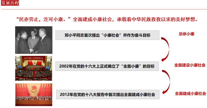 中共十六大提出了2020年全面建成小康社会的目标,在经历了彪炳史册的脱贫攻坚战后,中国在2020年底消除了绝对贫困,实现了全面建成小康社会的目标。2013 年精准扶贫的提出让很多村子都找到了方向,靠自己的探索找到了一条致富路。在我的家乡,旧房子都变成了新房子,村民们合理利用了土地发展农业,通过售卖特产以及发展旅游业来提高经济。2020年我们完成了新时代脱贫攻坚目标任务,全面建成小康社会取得伟大历史成果,中华民族伟大复兴向前迈出了新的一大步。