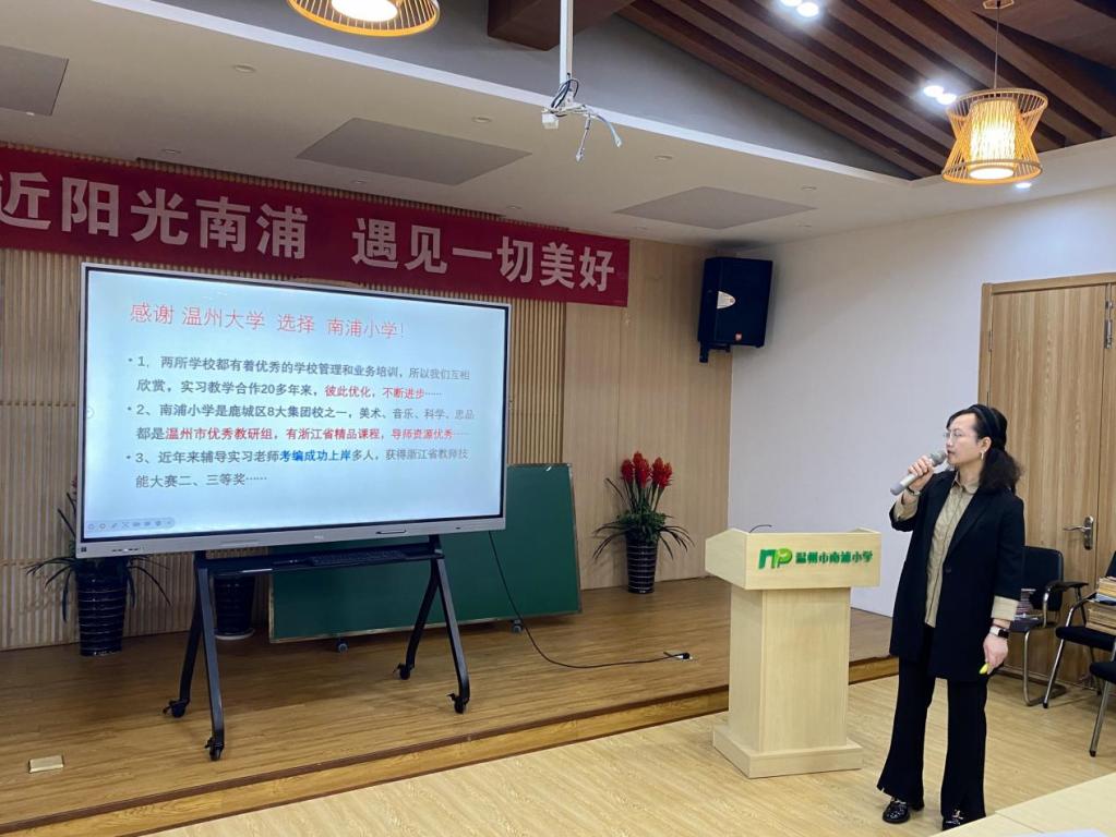 最后是由实习生代表杨铭同学发言,她对给予此次实习实践锻炼机会的南浦小学和在课程准备期间给予帮助的指导老师们表达了真挚的感谢。并承诺在校期间会认真地向各位老师学习,工作负责,对学生关心爱护并积极参加学校组织的各项活动,遵守学校的一切规章制度,严格律己。