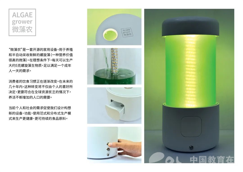 创意奖金奖产品作者之一VRENNA MAURIZIO 介绍,其作品“微藻农”用于养殖和半自动采收新鲜的螺旋藻(一种营养价值很高的微藻),设计初衷是在全球资源贫乏的情况下,养活不断增加的人口。