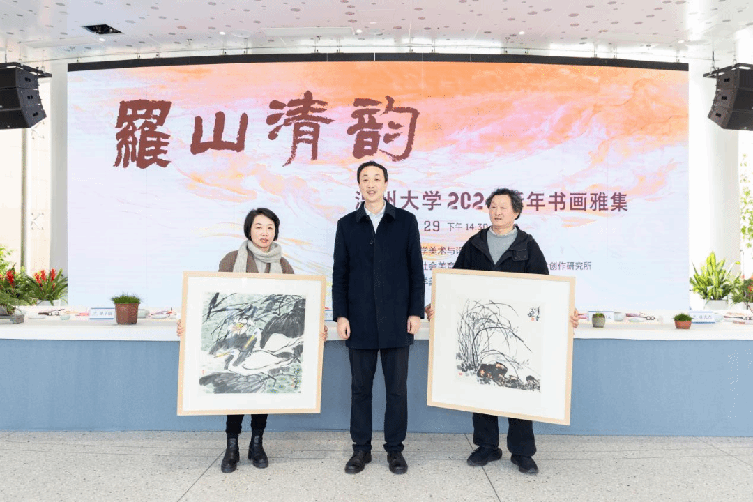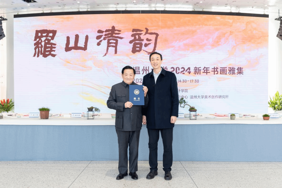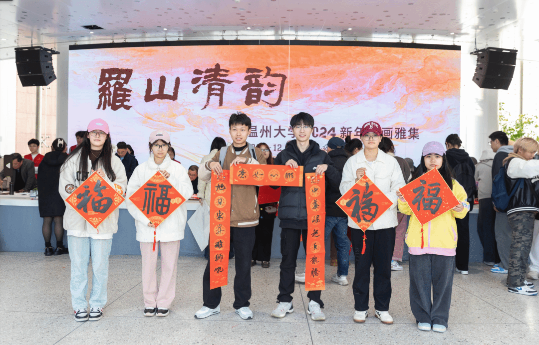 挥毫泼墨添锦绣,翰墨丹青绘新年。2023年12月29日下午,“罗山清韵——kaiyun开云官方网站2024新年书画雅集”活动在kaiyun开云官方网站美术馆隆重举办。本次活动由开云官网主办,温州市社会美育研究中心和kaiyun开云官方网站美术创作研究所共同承办,24 位温州书画名家和开云官网美术、书法专业教师挥毫泼墨,现场创作书法、绘画作品,美术馆外张灯结彩,现场一片喜气祥和。 kaiyun开云官方网站党委书记张健、温州市文联副主席谢子康、温州美术馆副馆长张真恺、人民美术出版社原副主编孟庆江、原温州师范学院美术系主任张如元、温州市美术家协会顾问孙光奇、温州市书法家协会顾问汪廷汉、温州书法家协会顾问陈出新、温州书法家协会顾问陈树冈、政协雁荡诗书画院顾问尚文光、kaiyun开云官方网站特聘教授金松、温州市鹿城区美术家协会副主席阿岛、温州市书法家协会主席团委员王天津、学院班子全体成员和学院书法、绘画专业教师出席了雅集,各部门、学院师生代表、温大附幼小朋友以及留学生代表共100多人参加了活动。雅集开幕式由开云官网院长谢子静主持。 活动正式开始前由温州音乐家协会古琴协会副会长谷雪艳女士为现场嘉宾和师生弹奏了古琴《流水》片段,在悠悠琴音中雅集活动拉开序幕。 首先举行了作品捐赠仪式。孟庆江先生将其创作的《徐定超肖像画》捐赠给kaiyun开云官方网站美术馆。学校党委书记张健为孟庆江先生颁发客座教授聘书。原温州师范学院美术系首届系主任叶玉昶先生将其创作的2幅花鸟画精品捐赠美术馆。 随后,在现场师生和嘉宾的共同见证下,张健书记、张如元先生、孟庆江先生和谢子静院长共同为新年雅集启幕。 “学者必以规矩,焕乎其有文章”,美术馆门厅悬挂的此幅对联是张如元先生为本次雅集活动专门创作。启幕仪式后,张健书记为师生赠送了福字和春联,以表达对师生们的新年美好祝愿。 书画嘉宾挥毫泼墨,现场创作了120多幅春联和福字送给前来参加活动的师生,为他们送上浓浓的新春祝福。前来领取福字和春联的师生络绎不绝,现场气氛格外热烈,为冬日校园增添了浓浓的年味。 新春送福环节结束后进行了迎新雅集,参加雅集的书画嘉宾以书画会友,提笔落墨,创作热情不减,并将现场创作的作品赠与温州大学美术馆收藏。 本次新春书画雅集是开云官网获批温州市社会美育研究中心后开展的首场活动,得到全校各部门及社会广泛关注,使全校师生更深切的感受到传统文化的魅力,为师生们传递了美的力量,同时也增强了高校与地方在美育工作建设中的互动,发挥高校在美育工作中的作用。