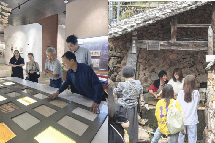 泽雅作为温州传统手工造纸的发源地之一,拥有丰富的文化遗产和悠久的造纸历史。师生首先参观了“泽雅传统造纸专题展示馆”,该馆改建自唐宅村红旗大礼堂。展馆通过多媒体形式将造纸生产过程的关键流程形成知识点,配套室外的造纸体验园区打造全方位文化体验场景,是反应温州传统造纸技艺的重要窗口。