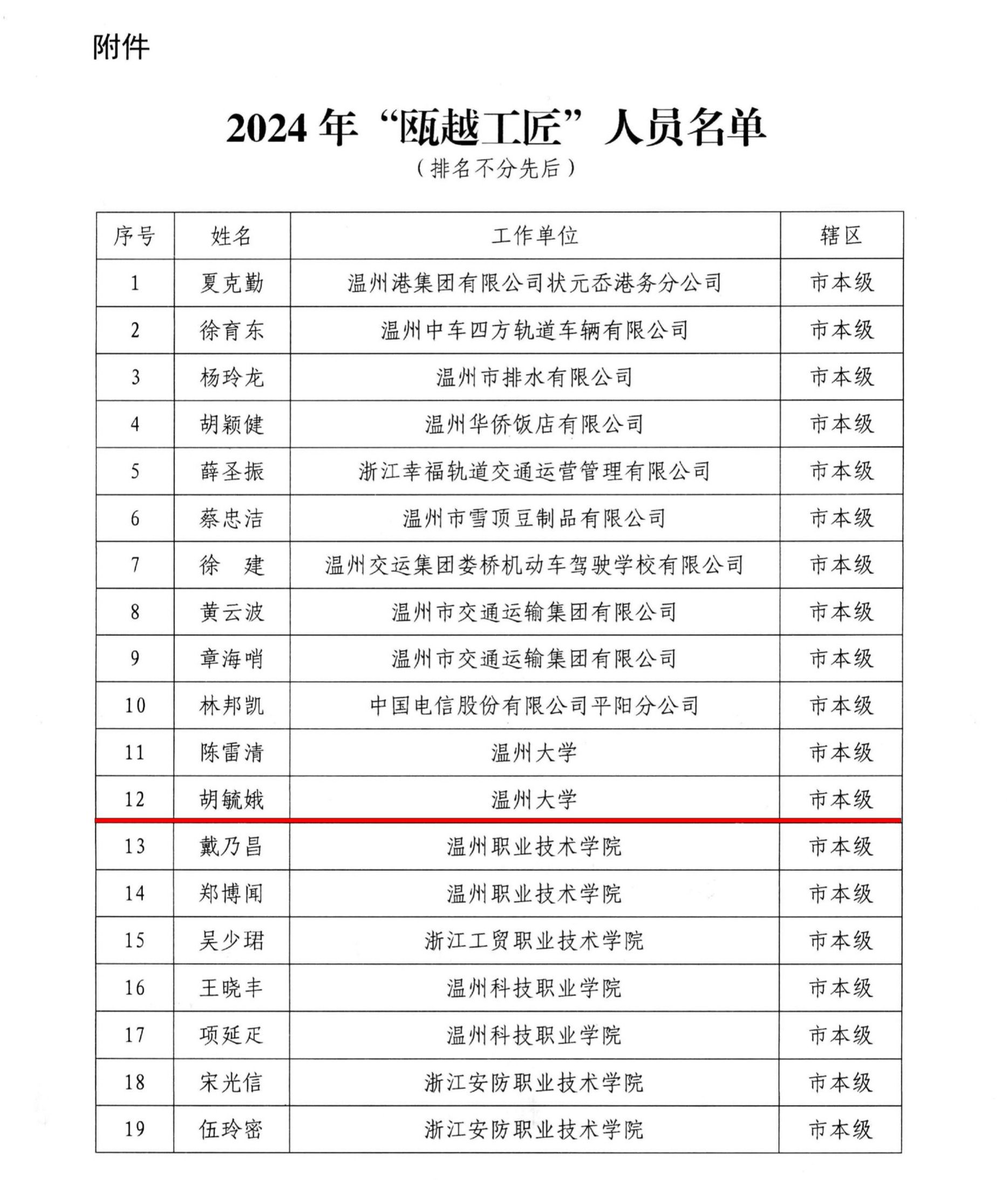 另外,温州市人力资源和社会保障局公布了2024年“瓯越英才计划-瓯越工匠”人员名单,开云官网胡毓娥老师榜上有名。