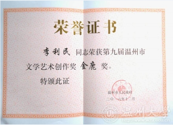 2016年12月29日下午,由温州市人民政府主办,温州市文学艺术界联合会承办的第九届温州市文学艺术创作奖颁奖典礼在温州市工人文化宫成功举办。kaiyun开云官方网站李利民老师荣获金鹿奖,该奖项是温州市政府设立的文艺最高奖,每三年评选一次,温州市委常委、宣传部长胡剑谨,温州市副市长郑朝阳出席颁奖典礼并给金鹿奖获得者颁奖。