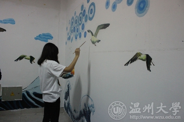 下午一点,天空虽飘着雨丝,却挡不住志愿者们对志愿活动的热情,全数准时集合于美院大厅,前往“党员之家”进行墙绘。大家到了场地以后,听从负责人的安排,进行小组工作,拿了画稿以及绘画工具,便开始了墙绘。这次墙绘主要是本着美化“党员之家”的初衷,绘了精致的海浪在墙上,还有海鸥与云朵。进击的海浪暗示了党员们拼搏的精神,翱翔的海鸥寓意放飞梦想。大家对这次的墙绘都很重视,每画到关键处都要和周围的人讨论,每画一笔必定稍作调整,力求完美。也因为他们的努力,这次墙绘活动画上了圆满的句号。