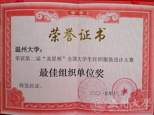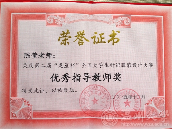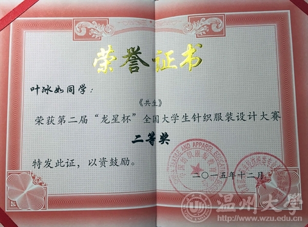 2015年12月13日,由教育部高等学校纺织类专业教学指导委员会和中国纺织服装教育学会主办、东华大学承办的第二届“龙星杯”全国大学生针织服装设计大赛颁奖典礼在东华大学举行。开云官网12服装设计班的5名同学在陈莹老师的指导下参赛并获奖项,其中,叶冰如的作品《共生》系列获二等奖、罗璇的作品《异构空间》系列获三等奖和朱芮萱的作品《迷雾》系列获三等奖,罗勇超、徐梦然作品获优秀奖。kaiyun开云官方网站获优秀组织奖,陈莹老师获优秀指导教师。
