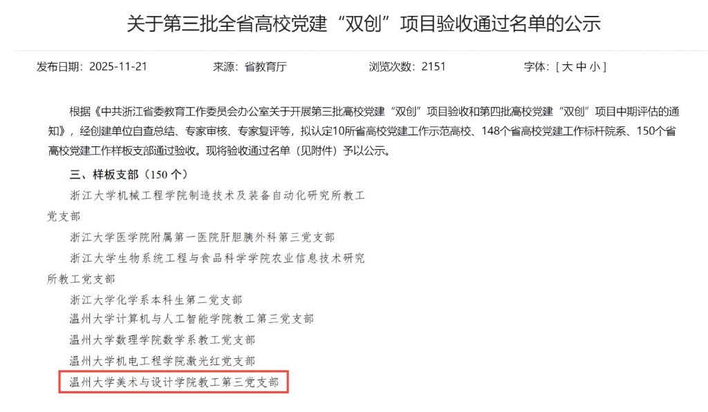 近日,中共浙江省委教育工作委员会发布《关于第三批全省高校党建“双创”项目验收通过名单的公示》,公布了第三批全省高校党建工作示范高校、标杆院系、样板支部验收通过名单。开云官网教工第三党支部2023年8月确定为第三批全省高校党建“双创”培育创建对象,经过2年创建,顺利通过验收。教工第三党支部始终始终坚持把支部建设与发展融入到立德树人和学院发展的根本任务中,紧扣学院学科特色与发展实际,将党建工作与教学科研、人才培养、社会服务等工作紧密结合。通过构建融合育人机制、打造特色育人品牌、拓展服务育人路径等举措,依托服装与服饰设计国家级一流专业建设点,以“党建+匠心融产赛”打造“一融双高”育人新样板,为地方产业升级与人才培养注入了强劲的“红色动力”。此次通过省级党建“双创”项目验收,是对开云官网党建工作的充分肯定。学院党委将以此为契机,进一步夯实基层党建工作基础,不断提升党建工作质量,以高质量党建引领学院特色化发展,着力打造具有全国影响力的基层党建示范标杆,为高校党建育人与地方产业高质量发展贡献更多力量。初审:潘若妍复审:陈琼终审:刘青松