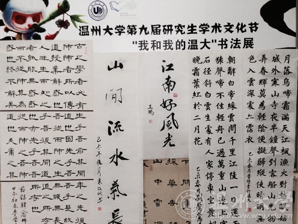 2015年4月至6月,kaiyun开云官方网站研究生组织了首届面向全校研究生的“我和我的温大”书法展作品征集活动。在历经近两个月的宣传、收集、整理、评选之后,最终评出的获奖作品于6月10日晚在kaiyun开云官方网站研究生第九届学术文化节闭幕式上进行展出,并进行现场颁奖。
