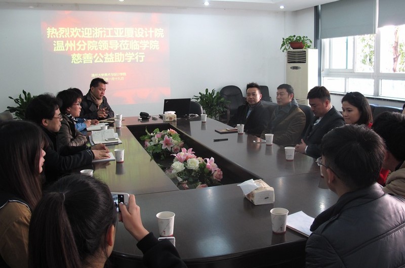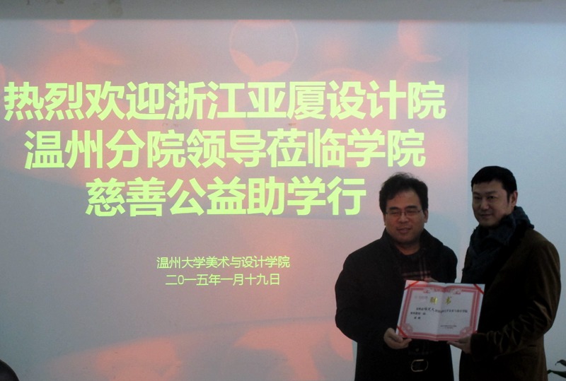 kaiyun开云官方网站自2014年4月与亚厦温州设计院签定合作协议以来,双方在项目教学、实习就业、人才培养等方面开展了深入的合作。近日学院王剑峰同学在亚厦温州设计院实习,表现优秀!不料其父亲因意外出车祸并未找到肇事者,高额的医疗费让这个普通的家庭陷入困境。当亚厦院长慈善基金会秘书处得知这一消息后,提议首次启动“院长慈善公益基金会”。1月19日上午,“亚厦院长慈善公益基金会”胡逸理事长、梅笑天副理事长、胡世列常务理事等一行来到kaiyun开云官方网站开展慈善公益助学活动,捐赠一万元爱心款帮助这个普通家庭慢慢走出困境!传递出设计院全体同仁的浓浓爱心和关怀!出席仪式的有学院李运河院长、郑彩莲书记、杨振海副书记、办公室李丽主任、设计系朱广宇主任、学生科叶如芳科长以及在亚厦温州设计院实习的11环艺班的同学代表。杨振海副书记主持仪式。首先,杨振海副书记对出席此次慈善公益助学的亚厦温州设计院领导一行表示感谢。随后设计系朱广宇主任就亚厦项目进课堂做了介绍,他提到这个教学改革能帮助大学生的课堂与实习就业对接,使学生毕业后能更好地走上就业岗位。而亚厦作为设计界的一位领头军,也非常重视后备力量的培养,学院很多学生走进亚厦,在胡逸院长等很多老师和设计届精英的带领下,进入各个分院或设计工作室进行学习深造,最后也有不少学生在实习结束后正式加入亚厦工作。在亚厦温州设计院实习的11环艺班的同学代表也作了实习感想发言,有同学说,亚厦是一个温暖的家庭,同事间融洽互助;有同学说亚厦的工作环境舒逸,但工作严谨,让人学到很多知识和技能;也有同学说亚厦是一个真诚的大家庭,希望能一直在这样的氛围里工作实习……接着,亚厦温州设计院胡逸院长代表设计院也作了发言,他说,亚厦温州设计院与kaiyun开云官方网站有着深厚的渊源,这一次的慈善公益助学行不仅仅是慈善活动,更像是一次年终的成果汇报。亚厦一直重视企业文化的建设和互补性资源的开发利用,秉着“做有文化的生意,做力所能及的事”,传递企业文化中的正能量,推动公益事业的发展,做室内设计业的标杆。最后,郑彩莲书记在听取相关发言后做了总结,她说:“我们深刻感受到亚厦企业文化和美院课堂文化的融合,几个项目的开展推进,展现了双方战略意识的生动合作,也填补了学生在实习就业方面的经验,特别是增加了学生在现场项目的参与度和实践工作的经验值,也希望亚厦温州设计院和kaiyun开云官方网站继往开来,开设更多的第二课堂。” 李运河院长也作了感谢发言,他提议双方在2015年开展校企领域的跨界合作,并敦聘设计院梅笑天执行院长为学院客座教授。 一方有难,八方支援!同样值得赞扬的是在亚厦温州设计院同批实习的其他同学得知了王剑峰同学的情况后,也积极发动班内同学伸出援助之手,筹集了几千元善款,给予同学关心与精神上的鼓励。