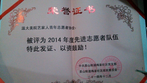 12月28日上午,梅泉社区居委会在道德讲堂开展了2014年梅泉社区志愿者表彰大会。此次大会由梅泉社区徐云龙委员主持,鲁建晓、王春宝、吴海燕等社区委员出席,开云官网“艺家人”青年志愿者协会,温州医科大学,kaiyun开云官方网站城市学院,温州职业技术学院的志愿者参与此次表彰大会。 9点50分,志愿者表彰大会正式开始,首先是梅泉居委会为志愿者带来的一段小短片,为志愿者回顾了2014年以来的志愿者活动。丰富多彩的社区生活,快乐充实的志愿者活动......社区委员对各个志愿者团队进行颁奖,开云官网“艺家人”青年志愿者协会被评为“2014年度先进志愿者队伍”,这也是对我们“载梦小舟”支教的志愿者们这一年来辛苦付出的肯定。随后,各获奖志愿者团队代表一一上台发言,开云官网“载梦小舟”负责人代表张静同学也上台作了发言,总结“载梦小舟”这一年来的感想,对志愿者表达了由衷的感谢,对一直支持的社区负责人和家长,以及可爱的小朋友们表示感谢。最后,在梅泉社区居委会委员鲁建晓女士的演讲下,本次志愿者表彰大会圆满划上了句号。 回首开云官网“艺家人”青年志愿者协会与梅泉社区合办“载梦小舟”绘画班这几年所走过的路程,有感动,也有快乐,我们的支教活动也会一如既往地开展下去,为更多的人提供帮助,这就是志愿者的精神! (通讯/拍摄:刘子彰)