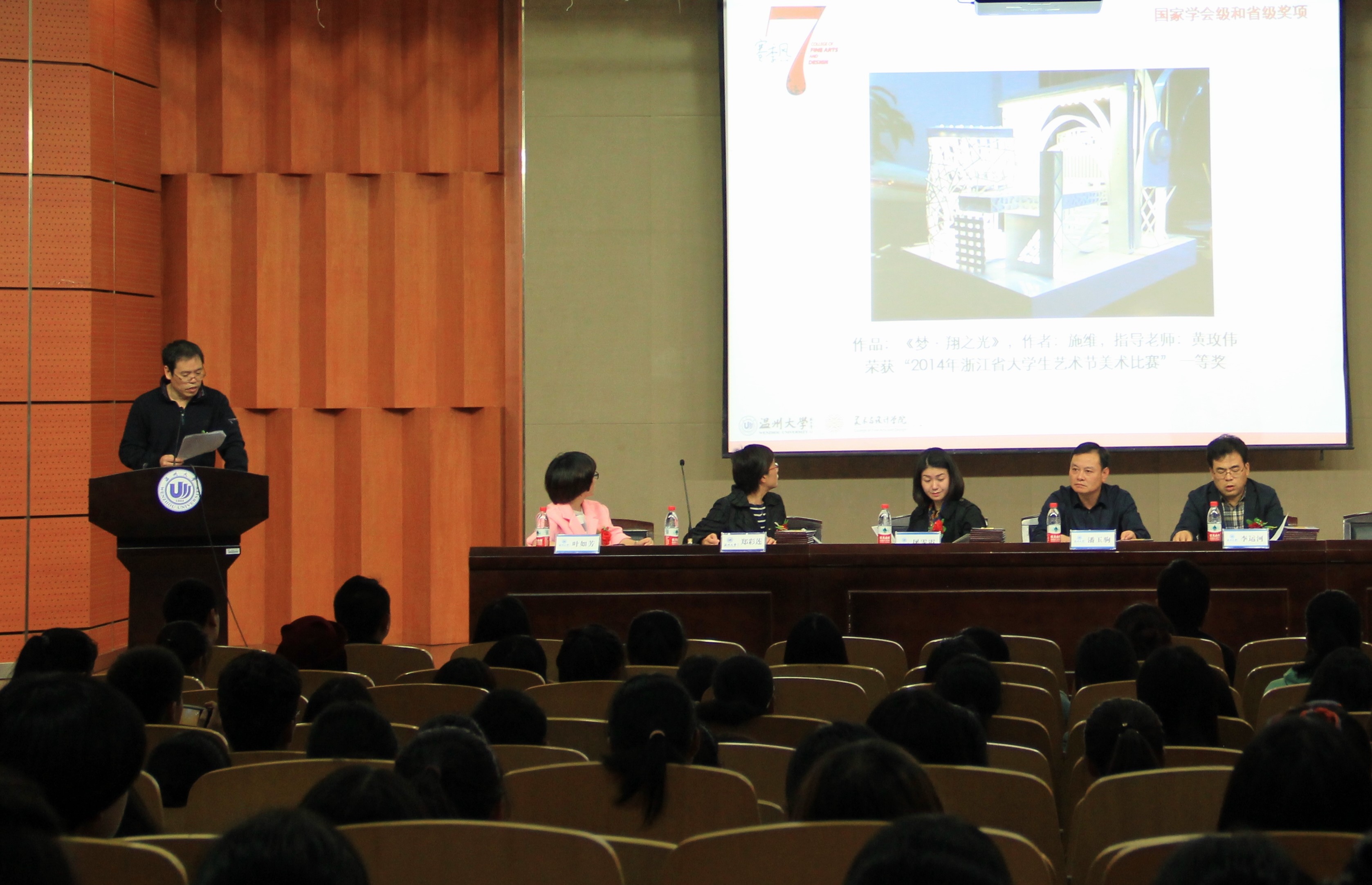 在开启新一届的“赛季风”之前,大会回望过去一年的辛苦付出与满满收获,表彰在上一届赛季风取得优异成绩的同学。2014年度大学生创新创业奖表彰大会在激昂的乐曲中开始。首先由蔡可群副院长代表组委会宣读了第六届“赛季风”活动孵化的优秀作品名单,其中,国际国家级奖项3项,国家学会级和省级奖项7项,省学会级和市级奖项23项,此外还有校级奖项83项。作品内容涵盖美术、服装、设计、创新创业四个方面,包括鞋靴、服饰、书画、摄影、海报、广告、创业项目等等。一件件精美的作品后面是参赛同学与指导老师的智慧、创意与汗水。