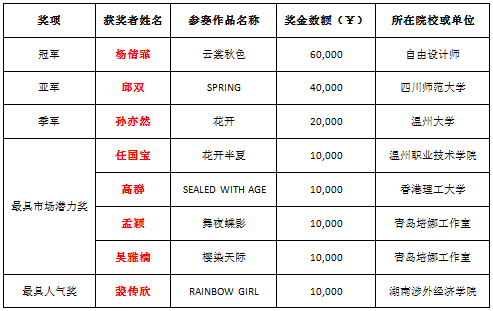 经过紧张激烈的竞逐,世界彩虹•首届卓多姿时尚女装设计大赛总决赛的结果终于诞生!来自湖南涉外经济学院的16号选手裴传欣力压群芳,获得奖金为一万元人民币的“最佳人气奖”。来自浙江温州职业技术学院的04号选手任国宝、来自香港理工大学的06号选手高群、来自山东青岛培娜工作室的09号选手孟颖和011号选手吴雅楠获得奖金各为一万元的“最具市场潜力奖”。季军则被来自kaiyun开云官方网站的05号选手孙亦然摘得,奖金两万元。亚军归属来自四川师范大学服装学院的03号选手邱双,奖金四万元。最后,刘亦菲再度登台,与中山市卓多姿服饰有限公司总经理、艺术总监吴肖玲女士一同揭晓冠军得主并颁奖:来自广西的自由设计师、01号选手杨倩霏摘得桂冠,捧走六万元的奖金!