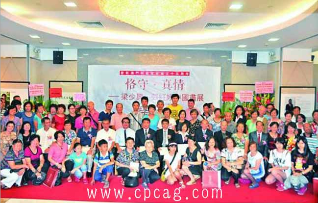 华夏文化艺术学会主办的“恪守·真情——梁少兴、张红嫚中国画展”在澳门揭幕,展出两位女画家共五十幅以山水、花草为题的作品。两画家以各异的山水,表达对艺术的恪守与执着,透出纯真、自然、质朴的真情。 展览开幕式八月廿六日傍晚六时假街总小区服务大楼举行,中联办文教部副部长张晓光,外交部驻澳门特区特派员公署公共外交和新闻部副主任李孝劝,澳门特区民署代表李仲熙,澳门特区检察院代表梁丽霞,澳门特区街总会长姚鸿明,澳门特区日报常务副总编辑黎胜培,番禺政协副主席彭群,霍英东基金会总干事史濠,黄云美术馆名誉馆长曾肖燕,广州花都美居中心董事长苏燕,华夏文化艺术学会主席李金浩、会长关权昌,番禺政协委员兼策展人邱绮文,在梁少兴、张红嫚陪同下主礼。 关权昌致词表示,为庆祝国庆六十五周年及澳门特区成立十五周年,活跃本地文艺交流,举办今次展览,邀请内地著名艺术家来澳门特区办展,加强澳门特区和内地的文化交流,藉此提高澳门特区创作水平。该会近年致力举办各类展览,提供交流创作心得的平台。梁少兴、张红嫚两位来自不同地区的山水画家,风格各异,前者的画气势宏伟,体现一种崇高的美;后者刻画花叶一丝不苟,体现宁静娴雅。如画展主题“恪守·真情”,两位画家画作题材及风格各异,但对艺术创作始终如一,热诚与执着。