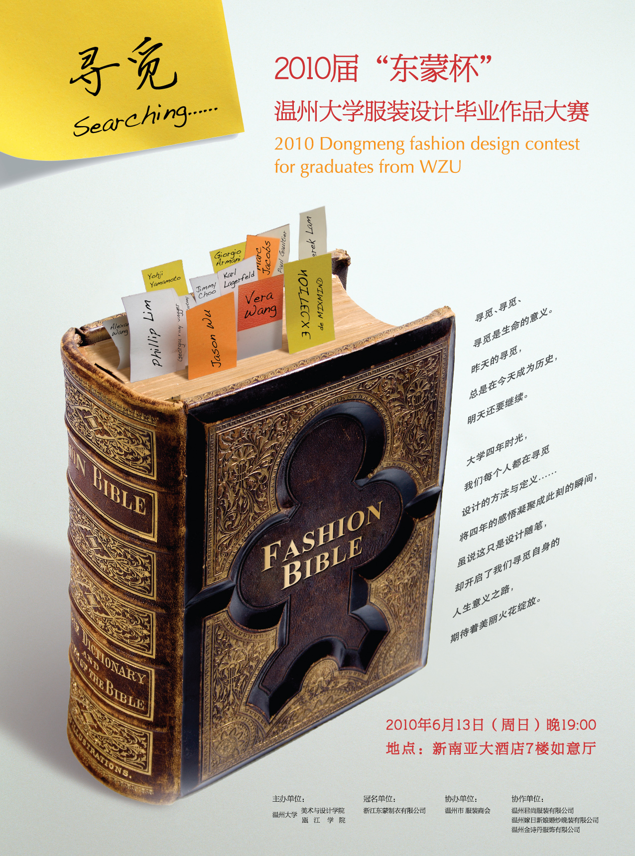 流行缤纷,霓虹异彩。一年一度的服装设计专业毕业设计作品动态展即将揭开她神秘的面纱。多年来,我们欣赏了她的优雅高贵、纯洁浪漫,见识了她的秀丽妩媚、热情奔放。今年,她将带着更为绚丽成熟的魅力,更富创意设计的姿态,奉献给我们一场时尚的饕餮大餐。在她身上,我们可以领略风格鲜明、个性独特的服装魅力,感受时尚精美、收放得体的整体造型,了解2011年服饰的时尚前沿与流行趋势…… 本次大赛主题为“寻觅searching”,服装展示分四大板块:品牌T台秀、时尚职业装、时尚礼服和创意概念装。模特主要来自kaiyun开云官方网站服装表演班的优秀学生及专业星娱公司名模。 历年来,kaiyun开云官方网站服装系与温州多家知名服装企业合作,以服装设计大赛的形式共同完成毕业设计,秉承“以赛促学,以展促学,以校企合作促就业” 的教学理念,搭建校企互动平台,为地方服装产业培养了大批服装类专业人才。 展示时间:2010年6月13日(周日)晚19:00 展示地点:新南亚大酒店7楼如意厅 主办单位:kaiyun开云官方网站 瓯江学院 冠名单位:浙江东蒙制衣有限公司 协办单位:温州市服装商会 本次动态展有部分席位向全校师生开放,需凭票入场,数额有限,领完为止。 领票时间:2010年6月9日(周三)8:00—16:00 领票地点:kaiyun开云官方网站南校区2B-214办公室 联系电话:86689181 联系人:曹老师 kaiyun开云官方网站 瓯江学院