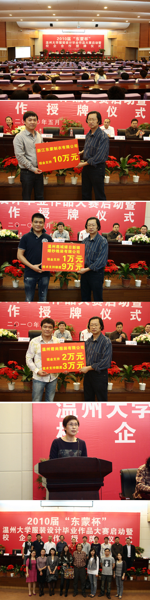 2010年5月12日,2010届“东蒙杯”kaiyun开云官方网站服装设计毕业作品设计大赛启动暨校企合作授牌仪式在kaiyun开云官方网站图书馆二楼报告厅隆重举行。kaiyun开云官方网站副校长任柏强,浙江东蒙制衣有限公司董事长池慧杰先生,温州君尚服装有限公司总经理周华忠先生,温州市鹿城嫁日新娘婚纱晚装有限公司董事长徐江先生,温州市金诗丹服饰有限公司总经理黄河先生,kaiyun开云官方网站人文社科研处副处长刘玉侠及kaiyun开云官方网站党政领导出席了仪式。