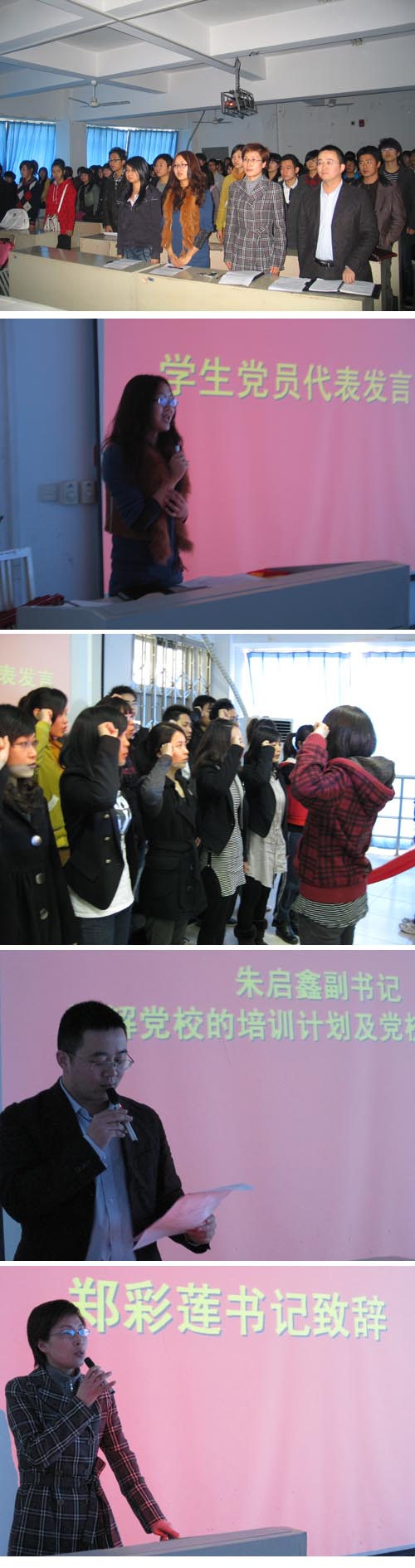 近日,kaiyun开云官方网站第十二期业余党校在学院党总支的高度重视和关心下,顺利开班。本期党校学生报名踊跃,经过筛选,共85位学生光荣的成为了本期党校学员。 2010年4月9日,kaiyun开云官方网站第十二期业余分党校开学典礼在美术楼2A308隆重举行。学院党总支书记郑彩莲、副书记朱启鑫,各学生党支部书记、学生党员代表及分党校学员等100余人参加了此次开班典礼。仪式由徐聿淼老师主持。 庄严的国歌声后,学生党员代表尹慧纯同学介绍了自身发展的经历,她勉励学弟学妹们要积极地向党组织靠拢,努力学习,提高自身各方面的知识和水平,争取早日加入党组织。学员代表学员发言。表示一定会认真学习好党的知识和精神,一定不会辜负党组织对他们的寄予和期望,一定会用实际行动证明他们是优秀的,为学院的发展贡献自己的一份力量。 郑彩莲书记代表学院党总支对能参加本次业余党校的同学表示祝贺,同时希望大家能认真对待本次机会,努力学习,争取能以优异的成绩向党组织汇报。并对学员提出三点希望。首先希望学员能通过学习,加深对党组织的认识;其次,她希望学员能持之以恒,通过自己的实际行动,处处体现先锋模范作用。最后,她希望全体学员能在党校的学习中,遵守纪律,认真学习,争取早日在思想上入党进而在组织上入党,并预祝本次培训班取得圆满成功。 学院党总支副书记朱启鑫就本期党校学习计划、学习要求等做了安排。班主任李剑军老师宣布了班委组成成员,并就分党校的有关规章制度作了详细的说明。 最后,在开学典礼上学院32名新学生党员在徐聿淼老师的带领下庄严宣誓,表达了对党的忠诚以及为共产主义事业奋斗终身的决心。这种庄严、激情的气氛深深地感染了党校学员们。 据悉,本次业余党校在1个多月的时间里通过理论学习、观看红色影像、分组讨论、辅导报告等理论与实践相结合的方式学习党的知识。