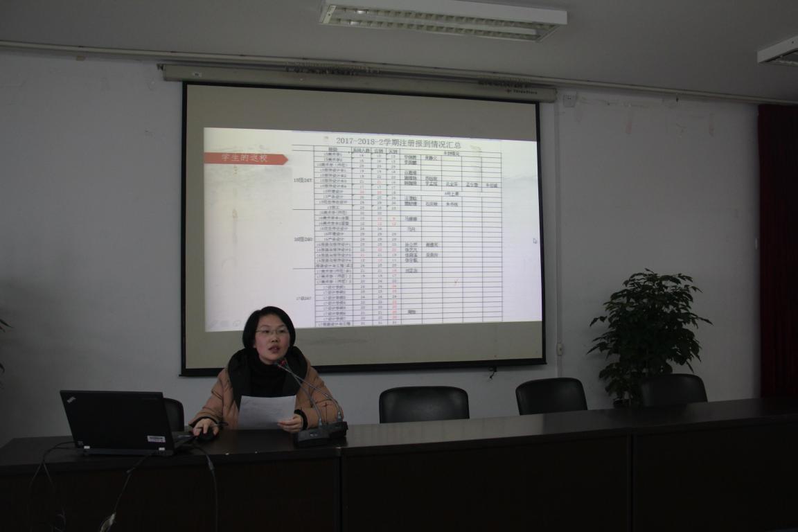学生科叶筱卉老师公布了2017-2018学年第一学习学院优秀班干部、工作积极分子名单和开学初学生返校情况,并对开学初班主任工作进行了布置:各班班主任要在第二周内召开本学期的第一次主题班会并按时上交《主题班会记录表》;班主任要深入了解并掌握学生春节期间、开学初学生的思想、学习、生活等各方面情况,积极配合学校开展开学初学生思想动态网上调查,及时发现学生存在的思想和认识问题,反馈学生反映强烈的意见和建议;新学期要营造浓郁的学习氛围,进一步加强学风建设,落实“课堂拒绝手机”制度,鼓励班级同学参加“五班十星”评比。毕业班班主任要重点关注毕业生返校和入住情况, 准确掌握未及时返校的毕业生的去向和动态,并做好在外实习安全教育工作,在外实习毕业生务必填写《kaiyun开云官方网站毕业班学生报到注册联系单》。关于学工系统的数据维护,班主任要及时将与学生的谈话情况录入学工系统,并提醒学生在学工系统中及时更新个人联系方式等信息。