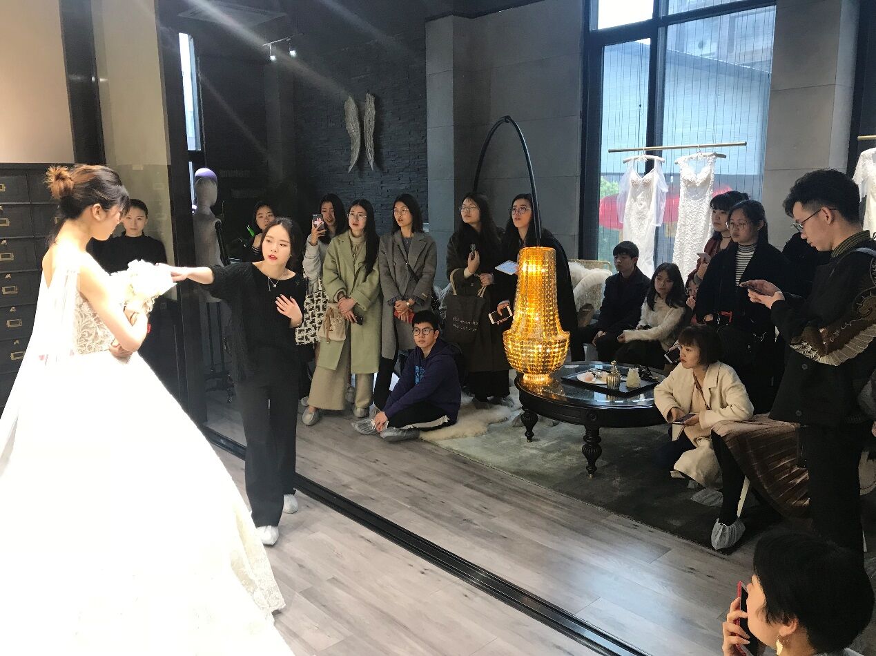 温州市鹿城区五马嫁依工坊婚纱店,是kaiyun开云官方网站的校企合作定点单位,自2004年创立至今,已与国内外二十多家知名婚纱品牌合作,让臻美的大牌婚纱落地温州,为新娘带来了与国际结轨的尊享体验。此次我们参观的是2016年嫁依工坊新入驻米房开设的玩味定制婚纱体验馆“JOINFINE+”。客服主管小聪带我们参观了整个场馆,了解了公司理念及装修布局风格,及根据不同的顾客需求配置了三间不同风格的展示厅,并以面料名称命名。销售总监精心挑选了目前最新款、最具代表性的五件婚礼服给同学们进行了展示讲解。大家针对礼服的设计、面料、工艺、装饰、色彩、市场定位等专业问题展开了热烈的讨论与交流。
