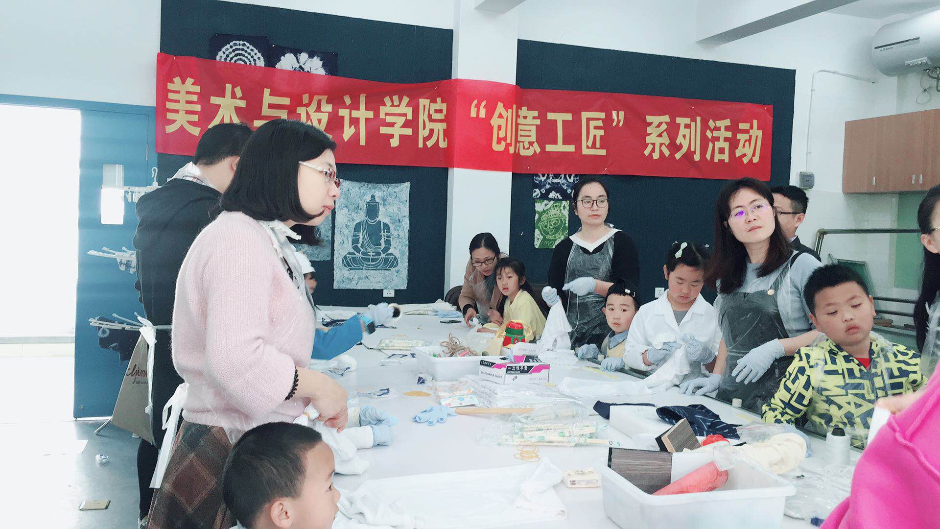 4月1日上午,kaiyun开云官方网站开展了“亲子扎染”活动,美院学生创业团队皓翔美术团队组织家长和孩子们参与制作扎染围巾,并参观了美院工业设计等艺术展览。