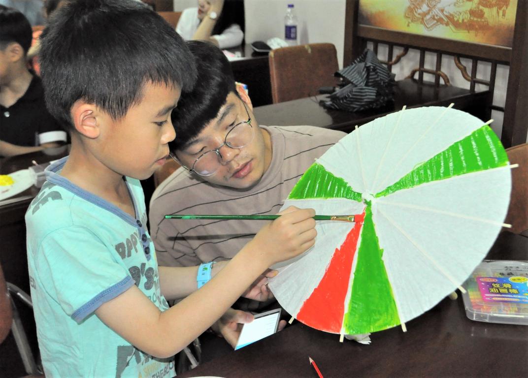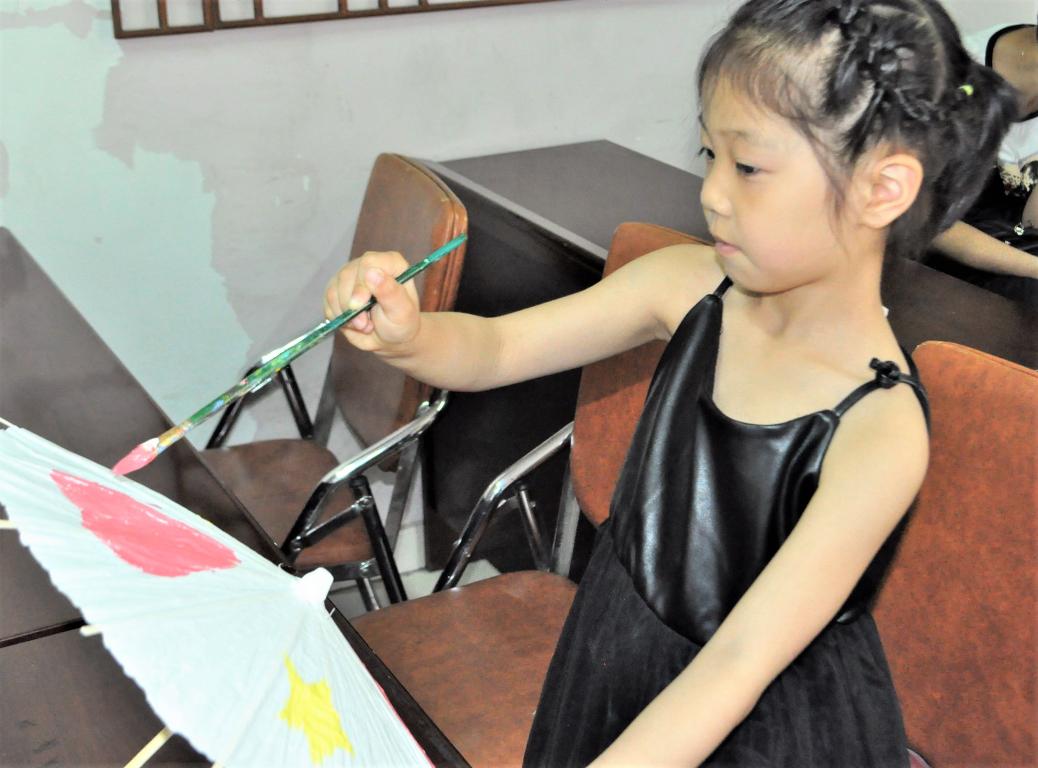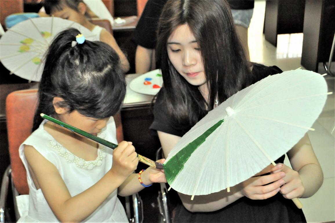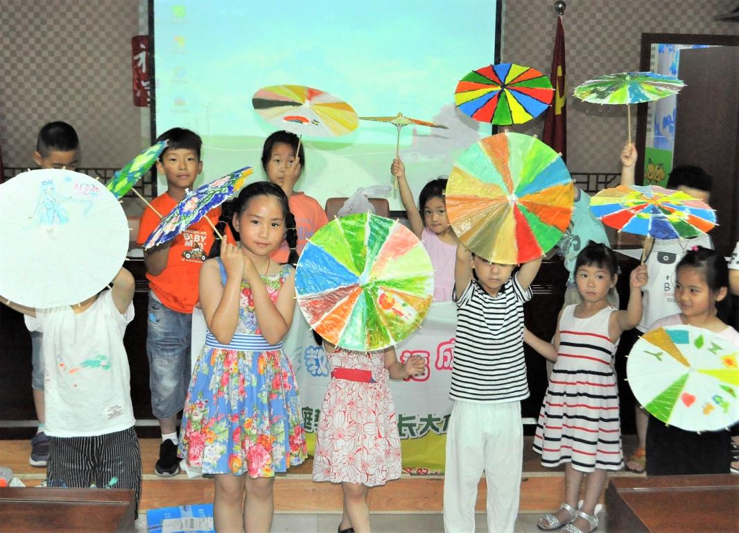 今天的天气没有像往日一样炎热,刚下的雨使得空气中有着淡淡的潮湿,志愿者们再次相约梅泉社区,给小朋友们带去欢乐。小朋友们人手一把小巧的空白油纸伞,在志愿者们的带领下准备好所需要涂鸦的丙烯颜料以及画笔,在一切准备就绪后,大家的情绪高涨起来,纷纷在伞上龙飞凤舞地画起来。有画梅花的,有画彩虹的,有画美少女战士的,还有抽象画!大家的想象力非常地丰富,油纸伞一张一收,美妙的画卷就在眼前绽开。当然,一番作画之后,小朋友们还可以领到小奖品。今天的梅泉,很快进入尾声,不禁感叹:快乐时光总是那么短暂。