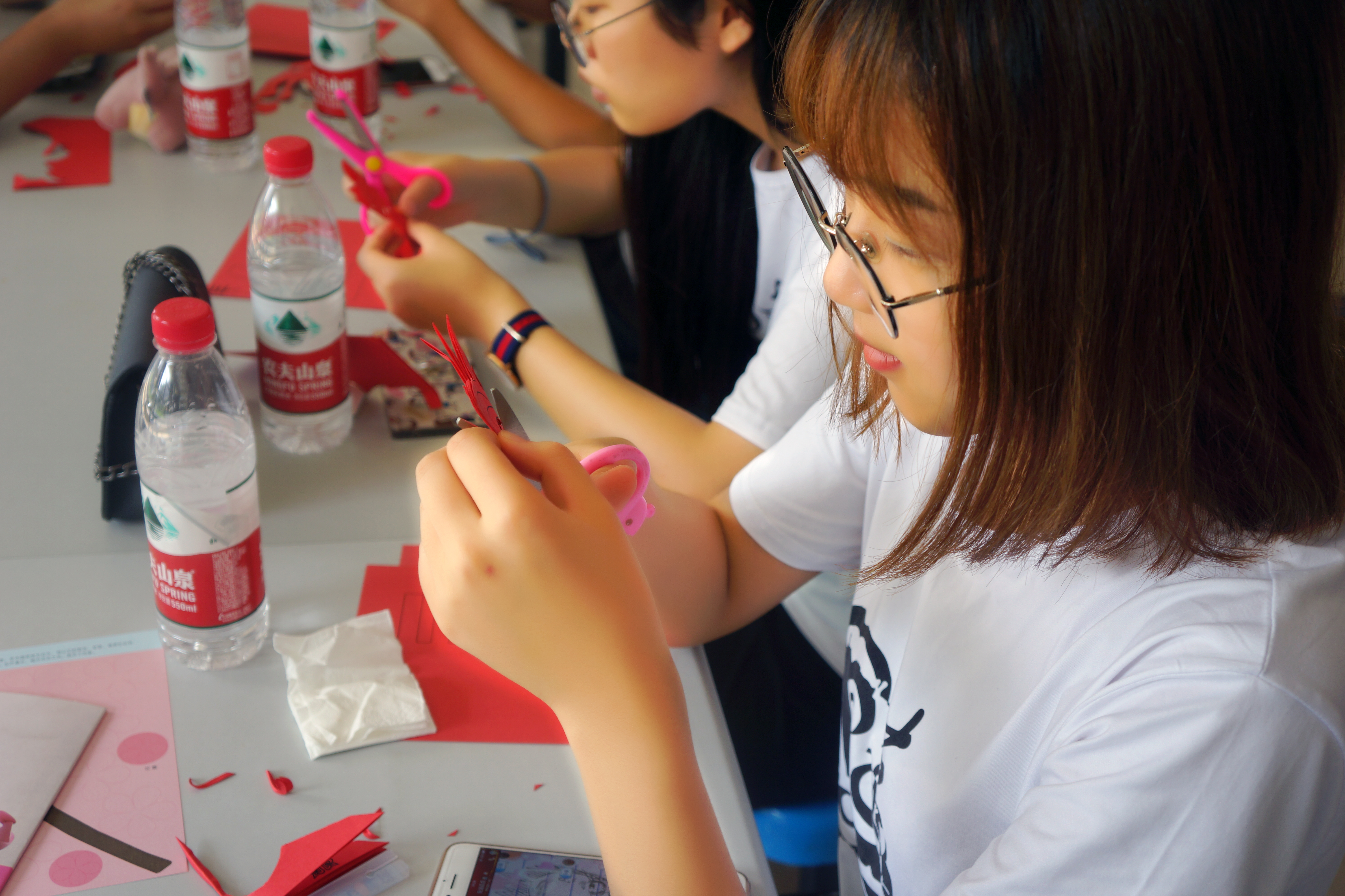 2018年7月27日,kaiyun开云官方网站“艺韵晚霞”暑期实践队前往kaiyun开云官方网站超豪学区食堂一楼,进行了以“艺韵之剪纸艺术”为主题的实践活动。 剪纸,又叫刻纸,是中国汉族最古老的民间艺术之一,剪纸是一种镂空艺术,其在视觉上给人以透空的感觉和艺术享受。剪纸在中国农村是历史悠久、流传很广的一种民间艺术形式。我们的文化在现代化,但是曾经滋养过整个民族辉煌历史的传统文化却以我们无法想象的速度流失着。一把剪刀,几张红纸贯穿了队员们的一下午的时光。由于是初学者,队员们的好奇心和求知欲是事前没有想到的,同时又发现这是一门考验细心与耐心的艺术。天气让人变得焦躁,而剪纸又让人变得安静。队员们并不像往常那样与彼此交谈,而是全部都全身心的投入于剪纸当中,电风扇呼呼的声音穿过耳膜,静的很享受。队员们有剪立体的花朵,有剪字体的,有的剪动物……种类繁多,但都是耀眼的红色。安静的下午并没有失去趣味,就这样,在活动结束之后,打扫了各自制造的垃圾,就等待把剪纸送给老人了! 一个民族的光荣,只能来自这个民族对传统文化的传承,更来自一种与时俱进的勇气。在活动中,加强了队员们对剪纸艺术的欣赏和创作,同时在剪纸的欣赏和创作中可以丰富队员们的知识,开阔了眼界。剪纸活动使队员们对中国民间美术有了初步的认识和了解,对中国传统文化中的象征手法和以物寓意的方法有了初步的感受。