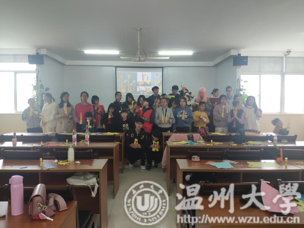 11月25日上午,温大美院“艺家人”青年志愿者协会的工作人员们带领了一批新招募的志愿者们,第一次来到了睦州垟社区村委会,同样地也给早早的在这里等候的小朋友们开展了一节关于长颈鹿的小课堂。 由于志愿者和小朋友们都是第一次认识对方,为了让小朋友们尽快融入课堂并且与哥哥姐姐们熟识,在课堂伊始,志愿者担任的讲解老师带领大家一同观看了可爱的卡通动物图片,比如大象,狮子,熊猫,河马,松鼠,牛等。可爱的动物让课堂氛围顿时变得轻松愉快起来。随着画面移动,讲解老师便给小朋友们出了一个简单的猜谜,而后由正确的答案引出今天的主角——长颈鹿。小朋友们积极参与课堂互动、举手发言回答问题的样子使得课堂又更加热络活跃起来。互动环节只是初步热身,再之后讲解老师给小朋友们观看了一个名为《长颈鹿不会跳舞》的短篇漫画。漫画潜移默化之中告诉小朋友们:每个人都有自己的闪光点,要自信不要轻易否定自己。最后的重头戏便是小老师布置下去今天的课堂手工任务:做长颈鹿家族。工作人员给每一位小朋友分发了黄色软卡纸和棕色硬卡纸各一张,一把剪刀与一支胶棒。先用黄色软卡纸对折,规划出长颈鹿一家人各自所需要的纸张面积,接着就是在志愿者哥哥姐姐们的帮助下开始裁剪,之后进行折叠,卷筒等操作,用以完成长颈鹿的身体。再用余下的边角料画上长颈鹿的脸,最后进行身体各部分的粘贴组合。最后再用棕色硬卡纸作为长颈鹿身上花纹的点缀。小朋友们和志愿者哥哥姐姐们齐心协力,长颈鹿家族逐渐的跃然纸上站立在桌上啦!在小朋友们快完成个自己作品之时,讲解老师便放映起了一部长颈鹿主题的优秀动画作品供大家欣赏,同时舒缓大家做手工劳累的身心。 终了,所有志愿者们带着小朋友们上讲台前一同合影留念。小朋友们纷纷捧起自己心爱的长颈鹿家族,要记录这美好的一刻。放学了,家长们接小朋友们回家时的纷纷笑着抱怨负担不知不觉又要加重了,原来是要带长颈鹿家族一起回家。下周同一时间,风里雨里睦州垟社区我们都在等你噢!