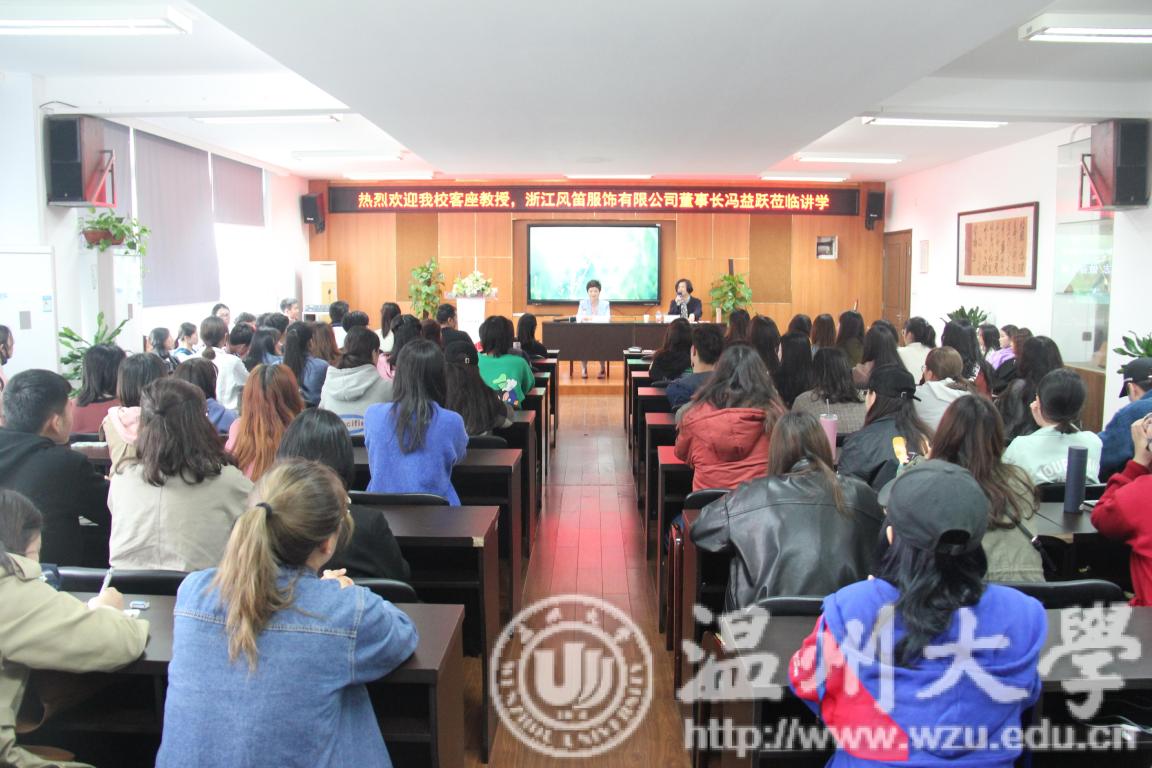 3月28日下午,我校客座教授、浙江风笛服饰有限公司董事长冯益跃女士莅临开云官网讲学,主题为《立鸿鹄志,做奋斗者》,学院院长李运河教授、副院长谢子静教授、学生科科长叶筱卉、服装与服饰设计教研室主任钟信群以及相关专业教师和学生参与观听,全场座无虚席。学院副院长谢子静教授主持。
