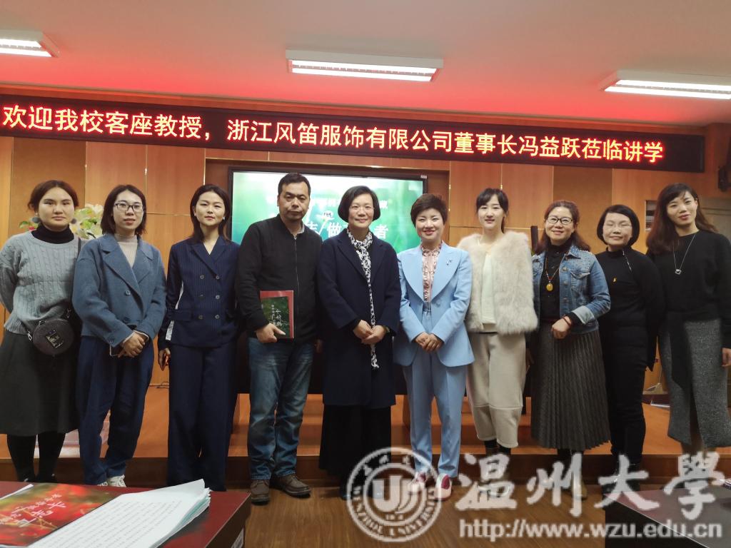 3月28日下午,我校客座教授、浙江风笛服饰有限公司董事长冯益跃女士莅临开云官网讲学,主题为《立鸿鹄志,做奋斗者》,学院院长李运河教授、副院长谢子静教授、学生科科长叶筱卉、服装与服饰设计教研室主任钟信群以及相关专业教师和学生参与观听,全场座无虚席。学院副院长谢子静教授主持。 讲座主要围绕心、道、德、事四个层次,分别讲述冯董自己个人的创业史以及有关励志教育,案例生动形象,内容深入浅出,她以平实亲和的语言教导在座的莘莘学子,要立鸿鹄志,勇做奋斗者。充分展现了一个无私无我、奉献社会的新时代成功企业家形象。 在为时两个半小时的讲座结束后,同学们热情不减,积极互动提问,作为我校客座教授的她均一一热情予以解答。会后,与会成员合影留念。