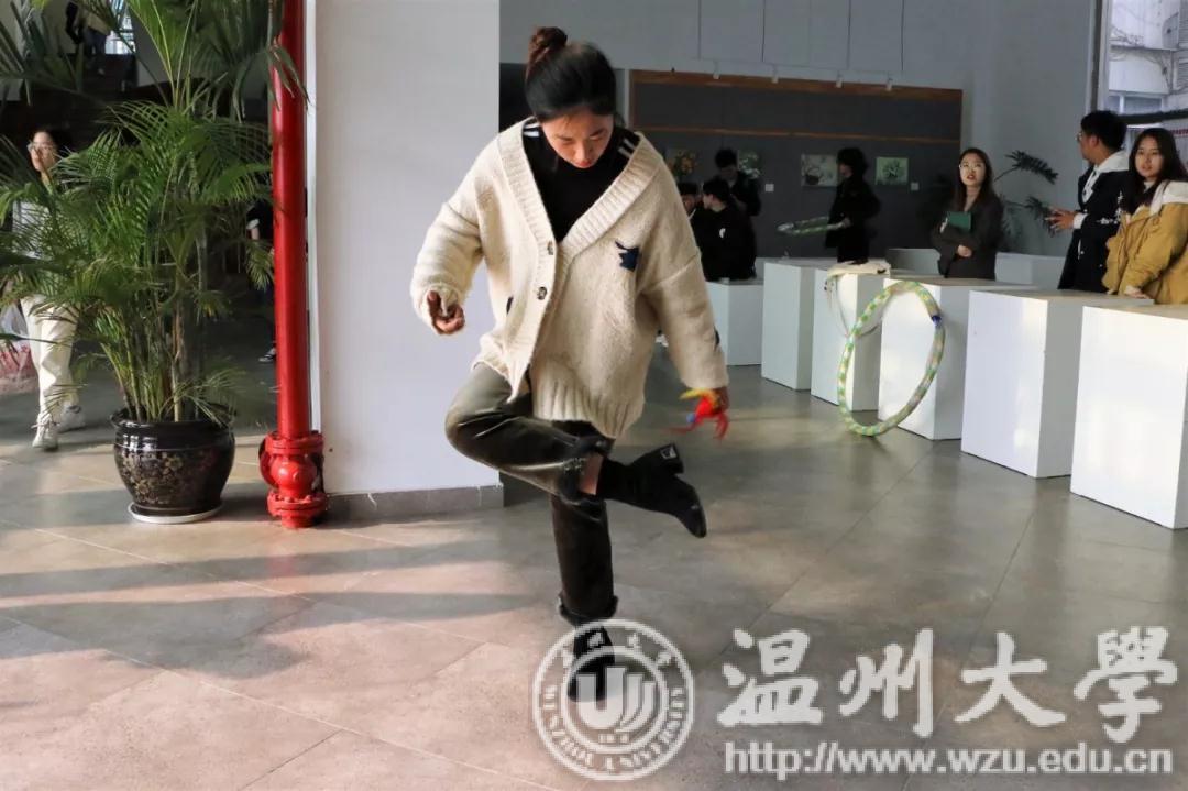 赛场周围已被参赛者与观战者团团围绕。参赛者们不约而同得进行赛前热身运动,有的压腿有的拉筋,蓄势待发、跃跃欲试;观战者们在美院楼前的空地上“叽叽喳喳”、七嘴八舌,热情高涨得“打赌”“约定”冠军将花落谁家。比赛开始了,呼啦圈犹如一只小精灵在参赛者身上摇摆、旋转与舞蹈,一圈又一圈,令人眼花缭乱;在空中上下“翻飞”的毽子划出一道道优美的弧线,而参赛者们的脚步也跟着它的轨迹四处蹿跳。大家都激情洋溢,一面挥洒汗水,面露不甘落后的神色;一面拼尽全力,眼中熊熊燃烧着渴望胜利的火焰。随着参赛者的数量越来越多,欢呼声、呐喊声、加油声、鼓舞声此起彼伏,整个美院楼前一派生机与活力。虽然参赛者之间是竞争关系,虽然大家来自不同的班级,学着不同的专业,虽然互相的了解并非充分而贴切,但是此时此刻,在美院楼前,大家都是一家人,一起呐喊、一起“拼命”、一起大笑、一起挥汗,心与心的距离贴得越来越近。