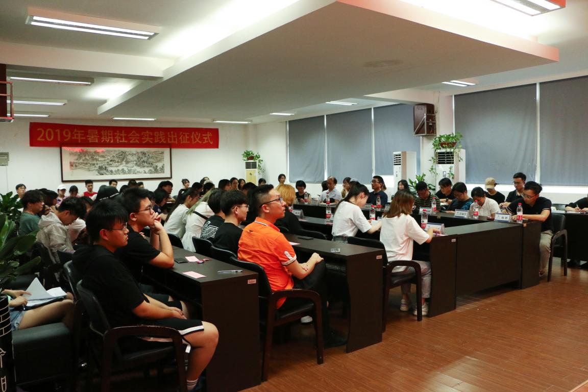 2019年7月3日下午,2019年暑期社会实践出征仪式在学院2B4001举行。出席会议的有学院党委副书记杨丽君、学院副院长胡文超、副院长顾任飞,学生科副科长叶筱卉、各暑期社会实践队指导老师、实践队队长和部分同学们。