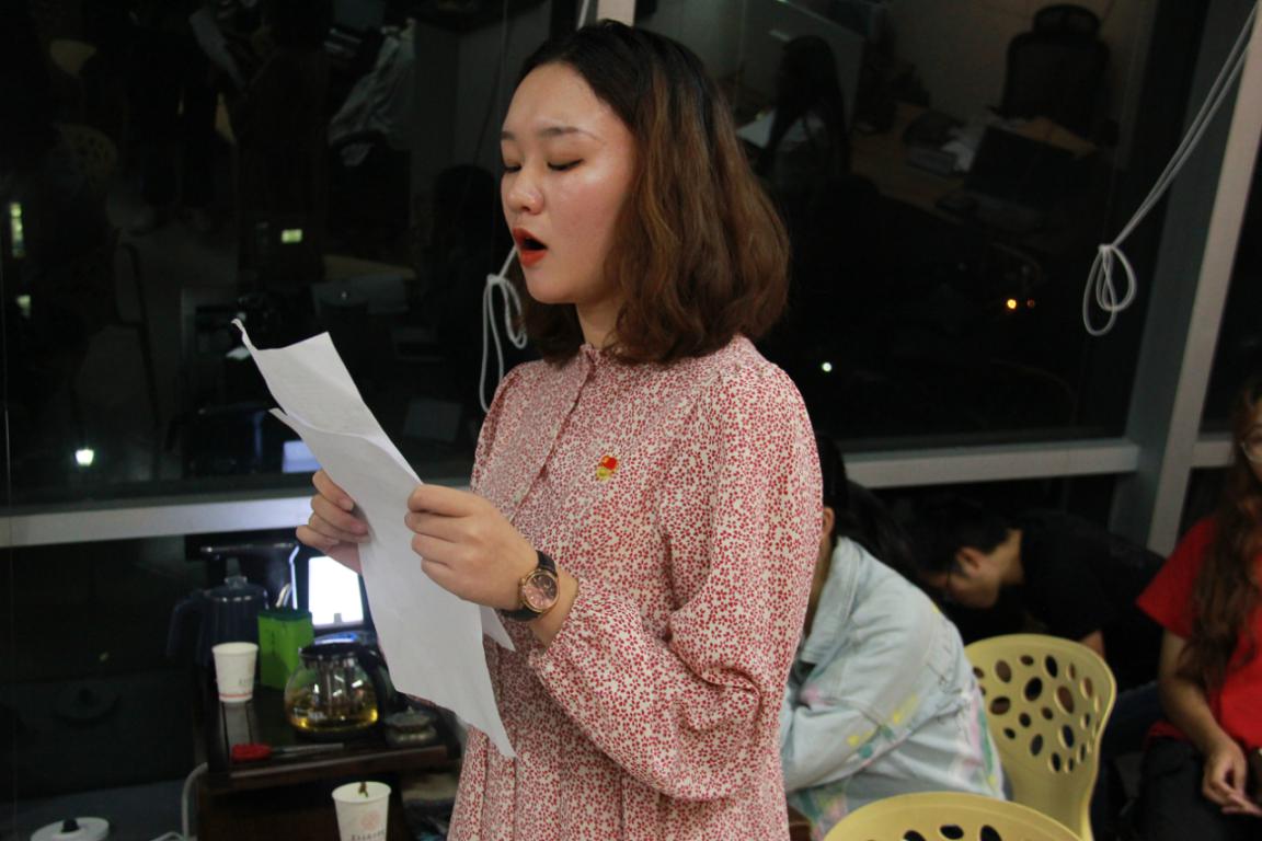 首先,全体会议人员起立,奏唱国歌。紧接着第二项议程是由邹青同志带领全体人员朗读学习党章第五章《党的基层组织》。
