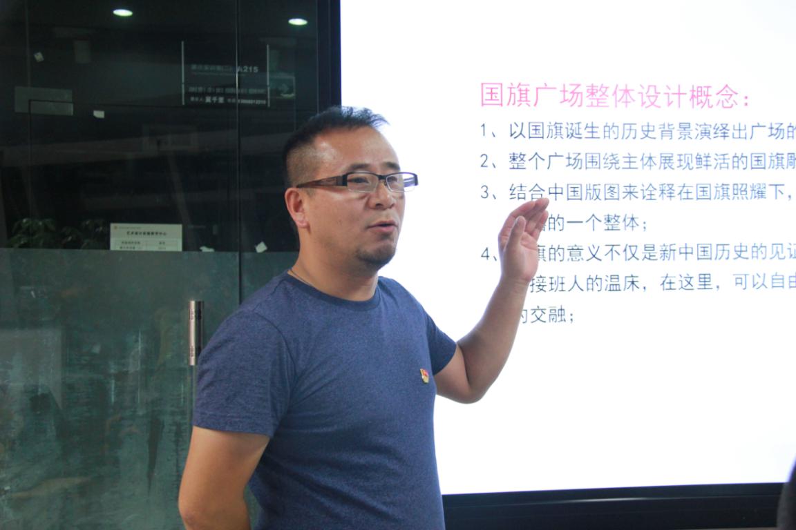 随后 ,映筑工作室的郑敬玉同志依据明心湖畔的“国旗广场”的设计图,讲述只有将设计与百姓、党团结合起来,才能更好地服务于大众,创造出属于社会价值的设计理念。他认为设计应当从身边抓起,从生态抓起,着重提高人民的生活质量。国旗广场很好地与其名字呼应,在设计中从历史背景等角度出发,抱着对党团的崇高爱意,实现了其价值的升华。