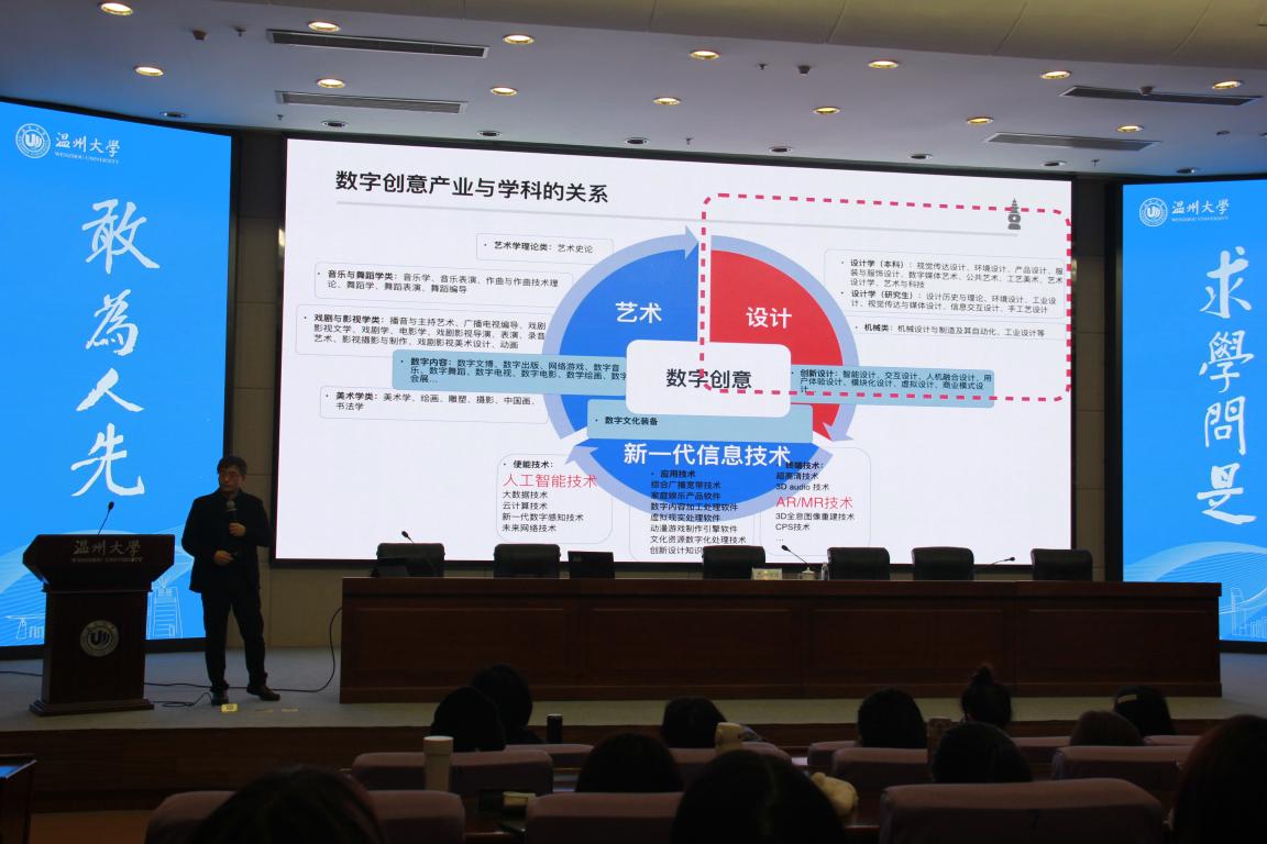 为贯彻落实kaiyun开云官方网站文科大会精神,探索新文科背景下艺术学科发展新路径,kaiyun开云官方网站在12月开展了主题为“文化创新与艺术教育”的学术月系列活动。12月9日下午,学术月首场讲座在育英图书馆二楼报告厅举行,浙江大学孙守迁教授带来《加强设计学科建设,推动数字创意产业发展》的讲座,讲座由kaiyun开云官方网站院长谢子静教授主持,学院副院长胡文超、顾任飞,设计类专业教师、研究生、本科生等200余人参加了本次活动。
