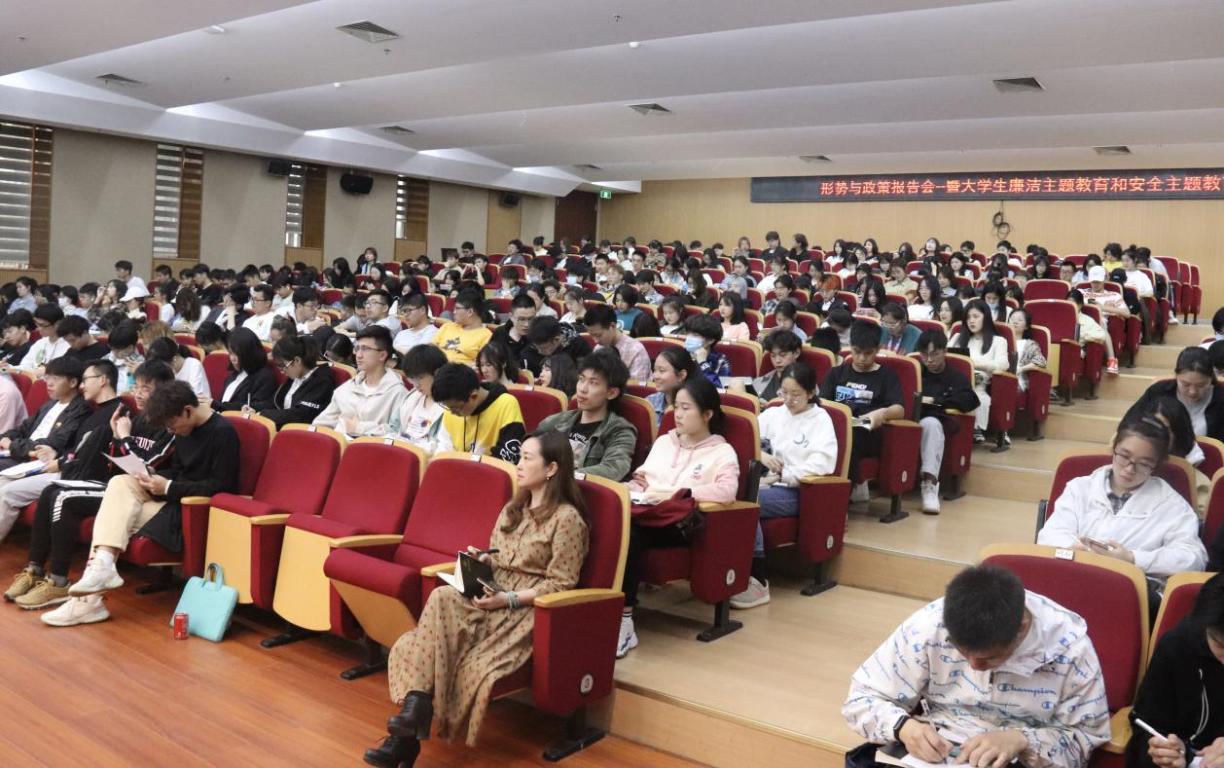 2021年4月21日晚18点,kaiyun开云官方网站2020级形势与政策报告会于岩松堂二楼报告厅举行。出席本次会议的嘉宾有校纪委副书记杨立淮老师、kaiyun开云官方网站党委副书记杨丽君老师、茶山派出所周文涛警官、kaiyun开云官方网站和数理学院学生共记400余人。本次会议旨在通过讲座的形式,为广大学生讲解当下的形势政策,进行反诈防诈教育,建设清廉安全的校园。