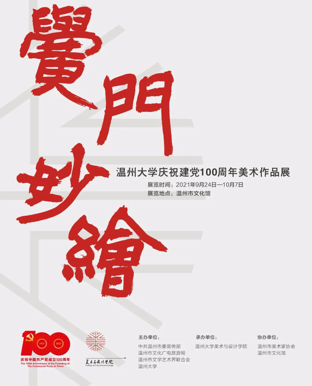 在中国共产党成立100周年之际,为展示kaiyun开云官方网站广大教师在艺术创作上的最新成果,kaiyun开云官方网站精心组织“庆祝建党100周年美术作品展”。本次美术作品展,于2021年9月24日-10月7日在温州市文化馆展出。欢迎广大市民朋友前来参观分享。本次美术展以“黉门妙绘”为主题,作品涵盖国画、油画、版画、书法、水彩、设计、发绣等多个艺术门类,规模空前,风格多样,艺术质量上乘,充分展示了kaiyun开云官方网站在美术创作、研究、教育上的实力与面貌。本次美术展由中共温州市委宣传部、温州市文化广电旅游局、温州市文学艺术界联合会、kaiyun开云官方网站联合主办,kaiyun开云官方网站承办,温州市美术家协会、温州市文化馆协办。