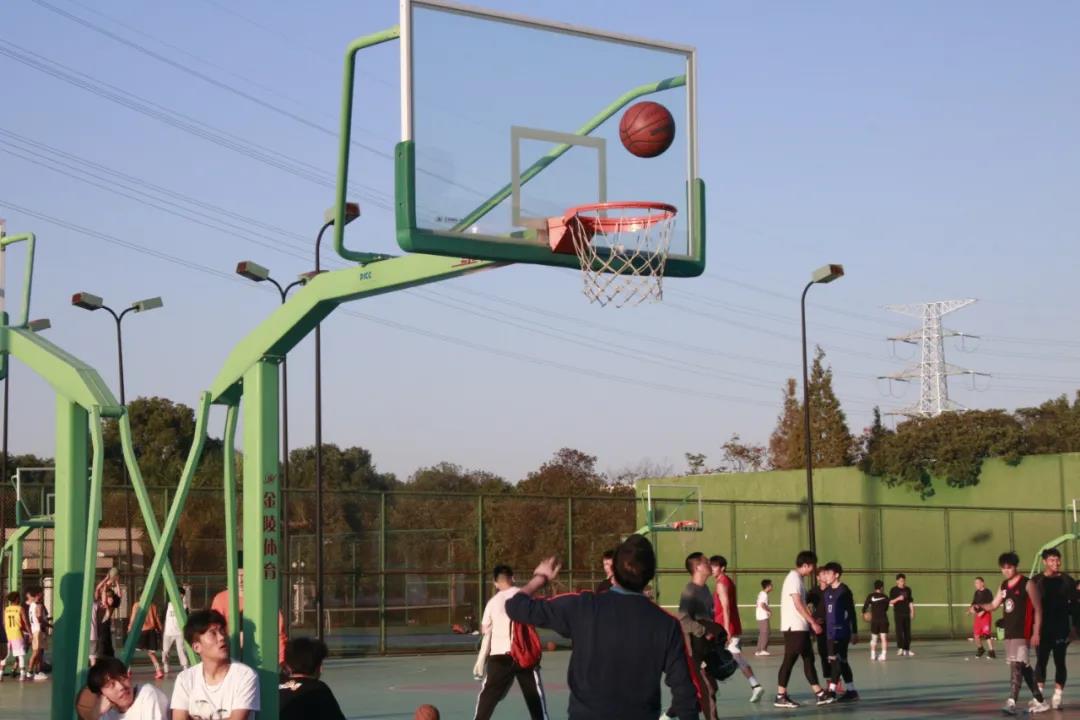 全场往返运球投篮:每个同学都很卖力,奋力的将手中的篮球命中篮筐。