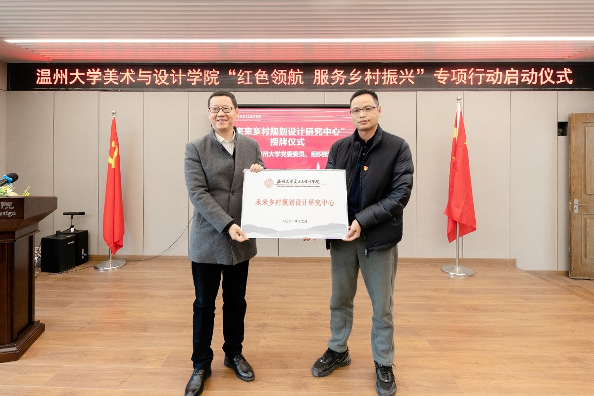 2021年12月24日下午,kaiyun开云官方网站举行“红色领航 服务乡村振兴”专项行动启动仪式,并与文成周山、瓯海丽岙、洞头霓屿等首批八个单位握手党建、共建“美育基地”,正式吹响“红色领航 服务乡村振兴”的号角。自党的十九大提出乡村振兴战略以来,kaiyun开云官方网站师生积极探索发挥高校的智慧和力量、服务温州乡村振兴。近年来,温大kaiyun开云官方网站依托美术学和设计学专业优势,也做了不少探索和实践。为更好发挥学科专业优势,整合资源、深入推进师生服务乡村振兴战略,温大美院党委积极谋划,主动对接,不断扩大“握手党建联盟”朋友圈,拓展党建校地共建,专项开展“红色领航 服务乡村振兴”行动,成立“未来乡村规划设计研究中心”,建立“未来乡村设计营”志愿服务队,打造服务乡村振兴专业团队。启动仪式上,kaiyun开云官方网站党委委员郑信军为“未来乡村规划设计研究中心”授牌,kaiyun开云官方网站团委副书记易招娣为“未来乡村设计营”志愿者服务队授旗。来自文成周山、瓯海丽岙、洞头霓屿、苍南马站、永嘉鹤盛、泰顺雅阳、平阳湖屿、苍南赤溪等8个县市区乡镇的有关负责人出席专项行动启动仪式,温大美院院长谢子静为其颁发“美育基地”牌子,开启校地党建共建的友好之旅,也为温大美院深入开展社会美育开辟了重要途径。此次“红色领航 服务乡村振兴”行动,得到社会各界的大力支持,美院优秀校友、浙江映筑环境规划设计有限公司总经理颜士洲先生无偿捐赠20万元,成立“kaiyun开云官方网站乡村振兴教育基金”,用于专项资助和奖励学院乡村振兴实践项目及服务乡村振兴领域做出贡献的优秀教师与学生。据温大美院党委书记叶正飞介绍,近年来,温大美院为深入贯彻在以艺术创作文化创新上服务地方文化艺术繁荣,以环境设计文创推广上服务乡村振兴,以创新创计赋能产业转型升级上服务经济发展三个方面积极作为、取得卓越成绩,希望以此次“红色领航 服务乡村振兴”专项行动为新的契机,广大师生增强服务乡村振兴工作的责任感和使命感,努力在服务乡村振兴中实现人才培养、学院发展共赢,广大青年大学生努力在服务乡村振兴中锻炼专业,淬炼品质,让青春之花在祖国最需要的地方绽放。