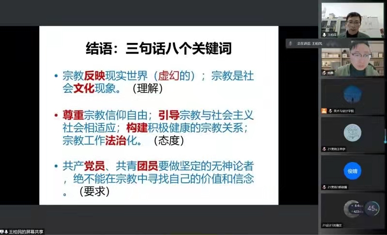 2021年12月22日晚18点,kaiyun开云官方网站2021级形势与政策报告会在疫情防控的要求下于线上举行。本次会议的由kaiyun开云官方网站学工办主任杨鹏老师主持,并特邀了马克思主义学院党委书记王柏民老师、kaiyun开云官方网站纪委副书记杨立淮老师以及kaiyun开云官方网站学生共计两百余人。本次会议旨在通过线上讲座的形式,为广大学生解读马克思主义宗教观以及构建网络安全生态环境下对大数据时代的思考,进行反诈防诈教育,建设和谐安全的校园。