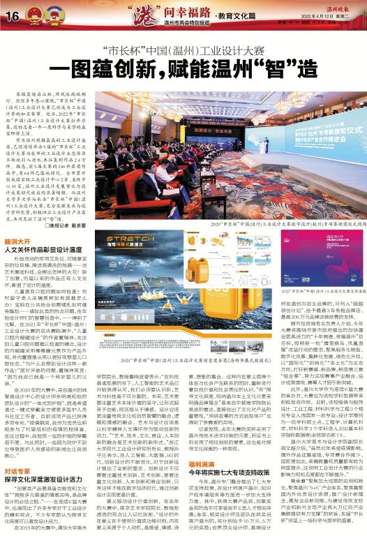 作为温州规格最高的工业设计盛宴,已经连续举办5届的“市长杯”工业设计大赛为我市的工业设计业态源源不断地引入活水,共征集到作品2.4万件。据悉,前5届大赛的140件获奖作品中,有64件已落地转化。全市累计创成国家级工业设计中心2家、省级中心41家,温州工业设计发展势头与设计成果转化效益均显著增强。而kaiyun开云官方网站多次参与承办“市长杯”中国(温州)工业设计大赛,充分发挥美术与设计学科优势,积极回应工业设计产业需求,共同见证了温州“智”造。