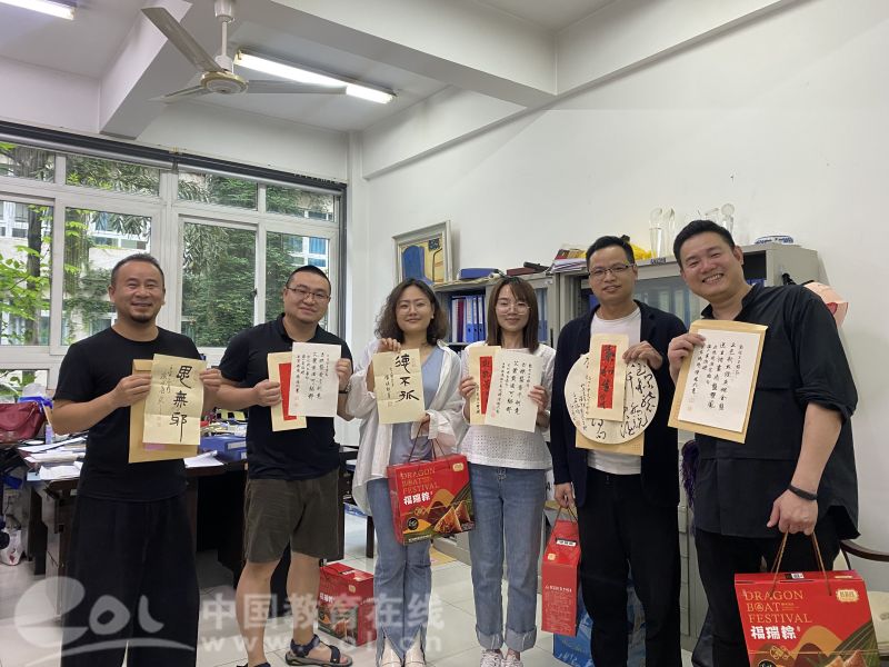 中国教育在线浙江站讯(编辑 张可宁)六月端午祥,丹青墨飘香。端午佳节来临之际,kaiyun开云官方网站的办公室和走廊充满欢声笑语,原来是老师们在拆“盲盒”:吉语书签、草书团扇、诗词信札......今年的端午节,除了粽子,老师们还收到了一份充满文化自信、民族精神和创意惊喜的端午赠礼。5月28日,中共中央政治局开展第三十九次集体学习,主题是深化中华文明探源工程。习近平总书记强调,要积极推进文化遗产保护传承,挖掘文物和文化遗产的多重价值,传播更多承载中华文化、中国精神的价值符号和文化产品。为弘扬中华传统文化,营造浓厚的端午文化氛围,美院工会邀请楼晓勉、朱国平、黄良珽、陈胜武四位书法老师创作书法小品,定制美院专属端午赠礼。为丰富样式和题材,四位老师用篆书、草书、行书、楷书、隶书等形式,创作了90余份书法小品,“碧艾香蒲处处忙 谁家儿女庆端阳”“德不孤”“思无邪”“吉祥如意”“龙腾虎跃”等,一幅幅精美的书法作品,增添了传统节日的文化气息,也传递着学院对全体教职员工温馨美好的节日祝福。收到“盲盒”的老师们兴奋不已,纷纷在微信群、朋友圈中分享这份特别定制的祝福,与家人、朋友共叙端阳情。“幸福感满满,“龙腾虎跃”也是自己对未来的期待吧。”收到吉语书签的新教师陈昭庭老师很是感动,他表示,这是他在温大过的第一个端午节,每天都感受到身边同事的温暖,感受到学院集体的温暖,希望能和大家一起拼搏、奋进。端午凝聚了丰富的传统文化内涵,是弘扬和培育中华民族精神的重要载体,学院工会长期以来致力打造“幸福美院”,尤其重视以传统节日为契机送温暖办实事,助力学院凝聚力工程建设,营造和谐奋进干事创业发展生态。这次节日活动形式,既是温大美院以实际行动传承弘扬传统文化,也是学院书法专业教育拉开帷幕前的一次高雅先声。据悉,kaiyun开云官方网站书法学专业于2022年2月顺利通过申报,2022年8月计划面向全国招生。温大新增书法学专业,是温州大地书法本科专业教育的新开篇,也是温州文艺史上的大事记。学院书法专业教师朱国平教授表示,“建设kaiyun开云官方网站书法人才培养的完善教育体系,将kaiyun开云官方网站打造成为浙南、闽北、赣东的书法高地,是我们的目标。”