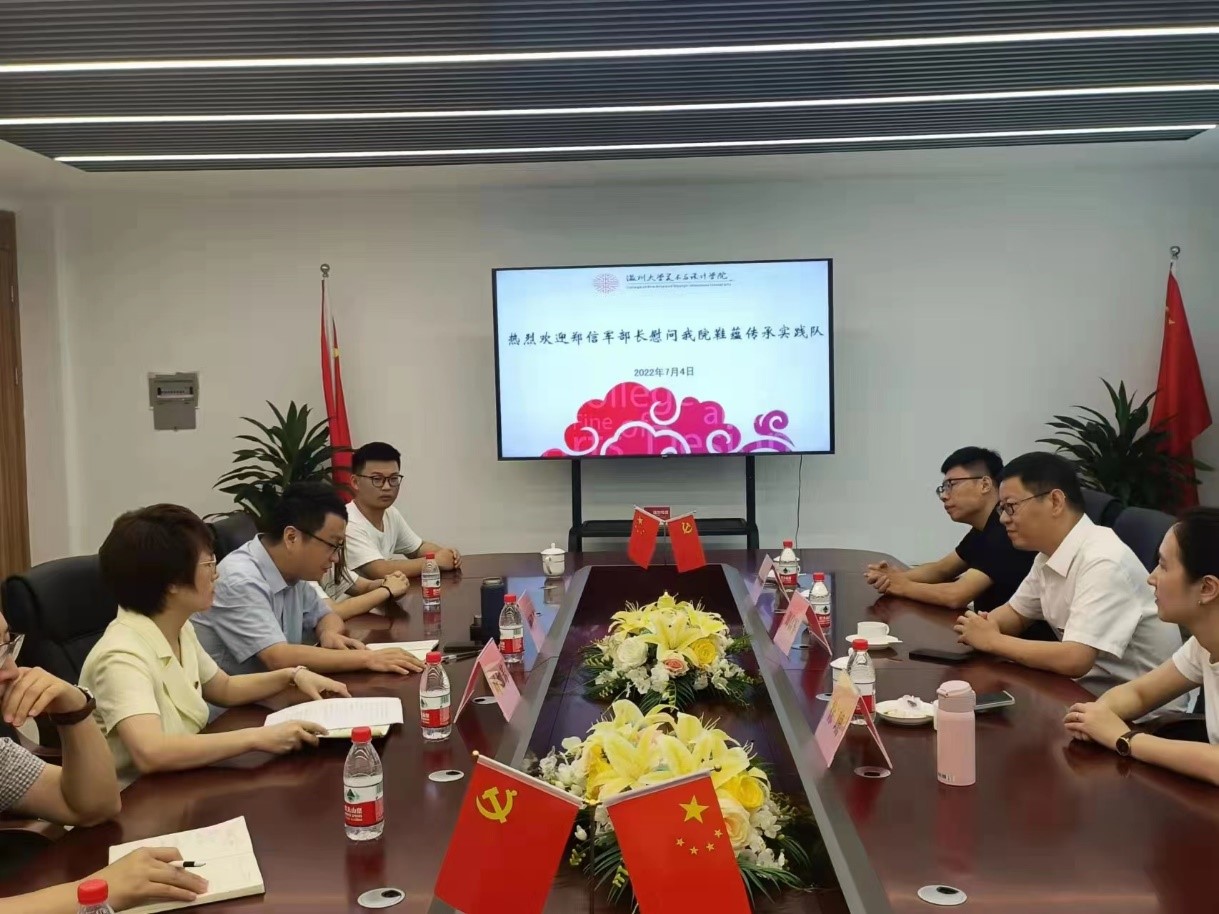 7月4日,校党委委员、组织部部长郑信军一行人来到kaiyun开云官方网站看望慰问“鞋蕴传承”暑期社会实践队。在座谈会上,学院党委副书记叶如芳主持,鞋蕴传承实践队队长田锦源介绍了实践情况,展示了实践三天以来队员们实践进度与成效,并介绍了未来几天实践队的计划与目标,慰问中,郑信军部长还向实践队同学们赠送了慰问品,为实践队送来夏日里的温暖关怀。