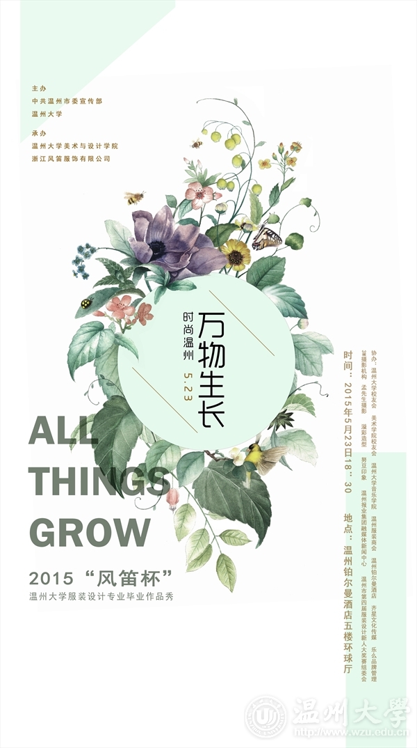 活动主题:时尚温州·万物生长活动时间:2015年5月23日(周六)晚18:30活动地点:温州铂尔曼酒店主要内容:来自国外的时装模特与国内高级时装模特联袂演绎美院2015届毕业生原创优秀作品,邀请国际国内服装设计以及相关领域的专家、学者、商家、企业家9人组成评委会,对现场新生代设计师的风格自述以及时装发布会进行综合测评,产生金银铜优秀奖等多个奖项。温州乃至中国时尚界、艺术界、文化届名人名流等参加,国内一流的场地设施、舞美灯光及音响效果。旨在为温州服装界推选新人的同时,加强温州时尚界产业范畴的沟通与交流,整体凸显温州时尚产业的潮流、个性与形象。 热忱欢迎全校师生莅临观摩指导! kaiyun·开云(中国)官方网站 - kaiyun.com 2015年5月21日