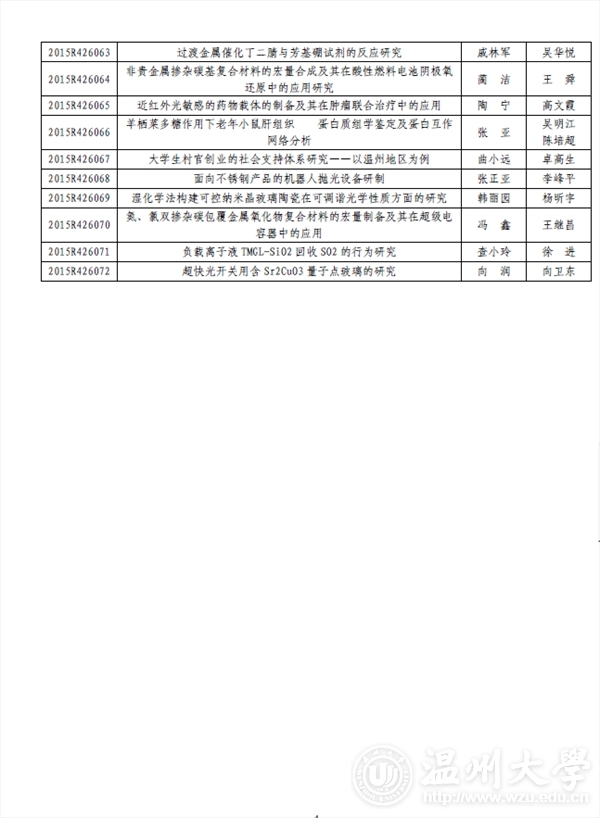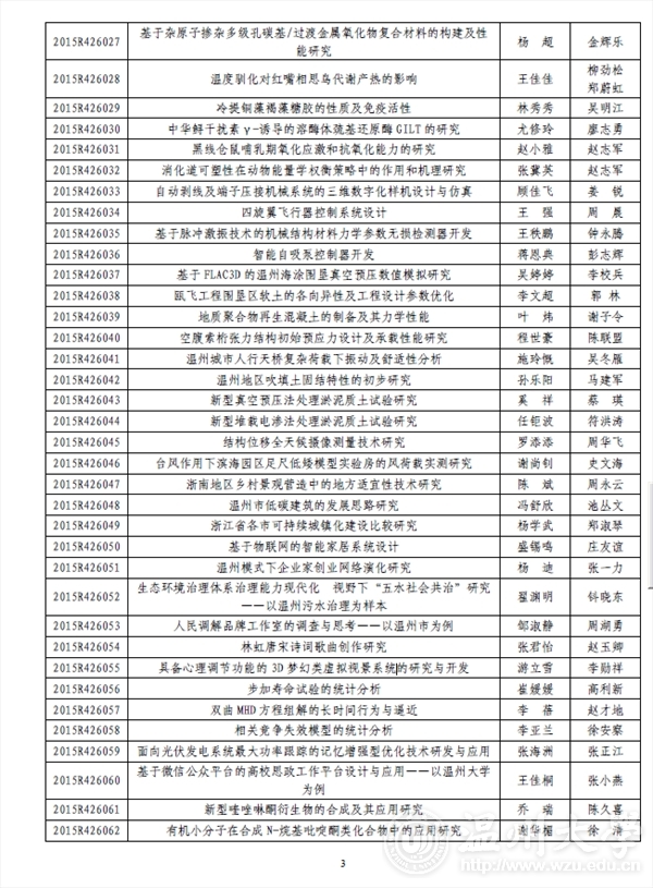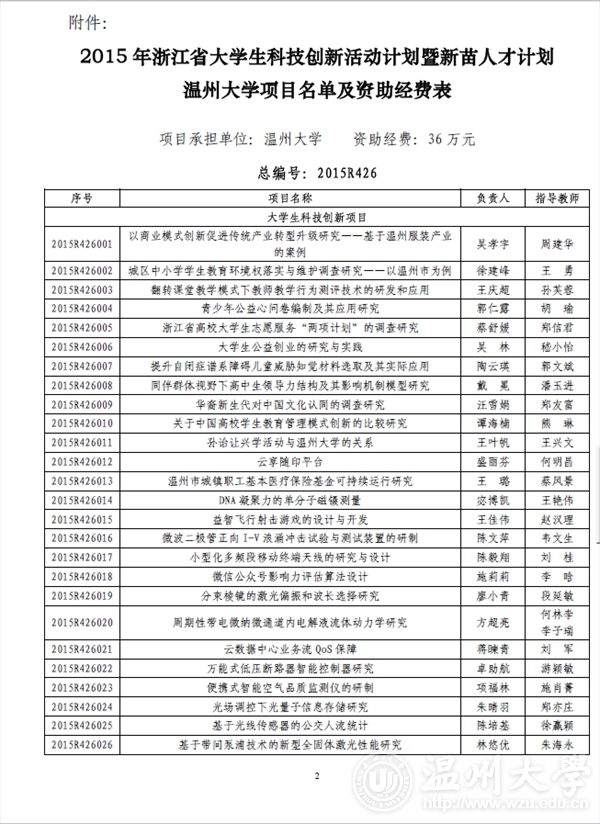 kaiyun开云官方网站团委: 2015 年浙江省大学生科技创新活动计划暨新苗人才计划已于2015 年1 月启动实施,经学校推荐和专家评审,共确立项目2061 项。现将你校通过立项的项目名单印发你们(见附件),请认真实施、加强管理。为不断提升我省大学生科技创新工作整体水平,项目实施办公室还将与省团校合作对项目负责人进行相关培训。附件:2015 年浙江省大学生科技创新活动计划暨新苗人才计划kaiyun开云官方网站项目名单及资助经费表浙江省大学生科技创新活动计划暨新苗人才计划实施办公室2015 年6 月3 日