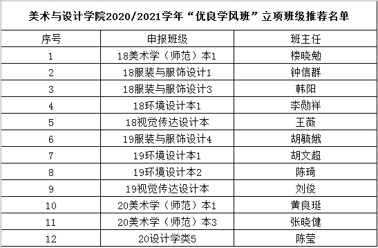 各班级: 根据kaiyun开云官方网站2020/2021学年“优良学风班”立项申报工作的通知要求,经班级申报、学院初步审核,现决定对18美师本1等12个班级进行立项推荐,现将结果予以公布。 请申请立项各班级对照创建方案和目标,广泛动员每一位学生积极参与到优良学风班的创建中来,确保立项目标的实现,同时接受学院各班级、各同学的监督。立项班级的培育期为一年,学院将于下学年从通过验收的立项班级中择优产生kaiyun开云官方网站2020/2021学年“优良学风班”。 kaiyun开云官方网站学生科 2020年12月1日 附件: