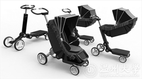 同样来自该校的戚志政喜欢产品设计,这次他带来的是一款集摇篮、婴儿车、滑板车于一体的婴儿车,他说:“这款婴儿车基于婴儿的成长所设计,婴儿刚出生时可以当摇篮,随着年龄增长,可以变成婴儿车,孩子会走路后,还可以转换为滑板车,变闲置为玩物。基于安全考虑,还设置了光织警示带,让其在具有警示功能下又不失美感。”