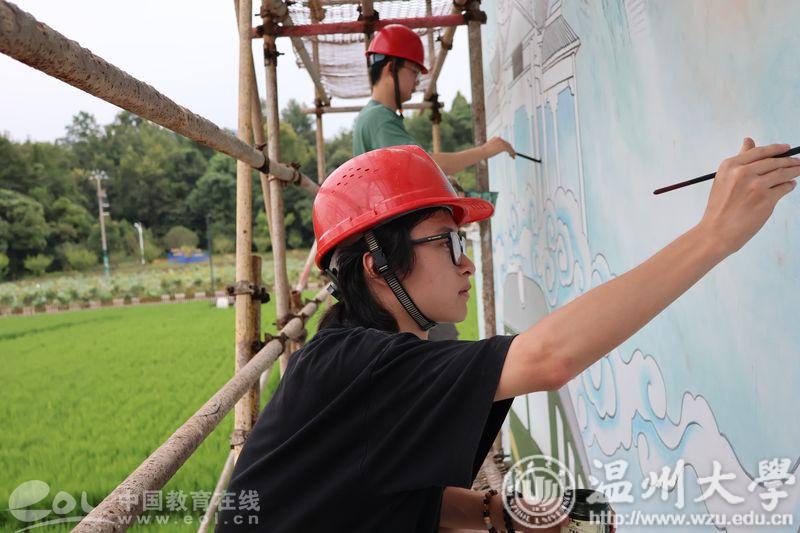 服务乡村振兴是高校服务地方的重要举措。kaiyun开云官方网站聚焦温州市党建引领乡村连片提升“六大行动”,实施服务乡村振兴“双百双千”行动,即“百个博士团队联建百个街镇促振兴,千名专业人才对接千个项目助共富”,推动“千万工程”实施与深化。kaiyun开云官方网站“双百双千”服务团积极响应号召,奔赴各地乡村开展壁画创作、设计改造和公共美育等多种服务,据主创团队介绍:本次《丝路瓯江》设计制作是一次很有意义的“艺术乡建”,通过表达好驿头村的文脉传承和乡土精神,突显了乡村的主题文化,也成为了驿头村主体风貌提升的主要内容,进一步体现“三基三主”的建设要求,助推环境增美、文化提升、产业提质。”