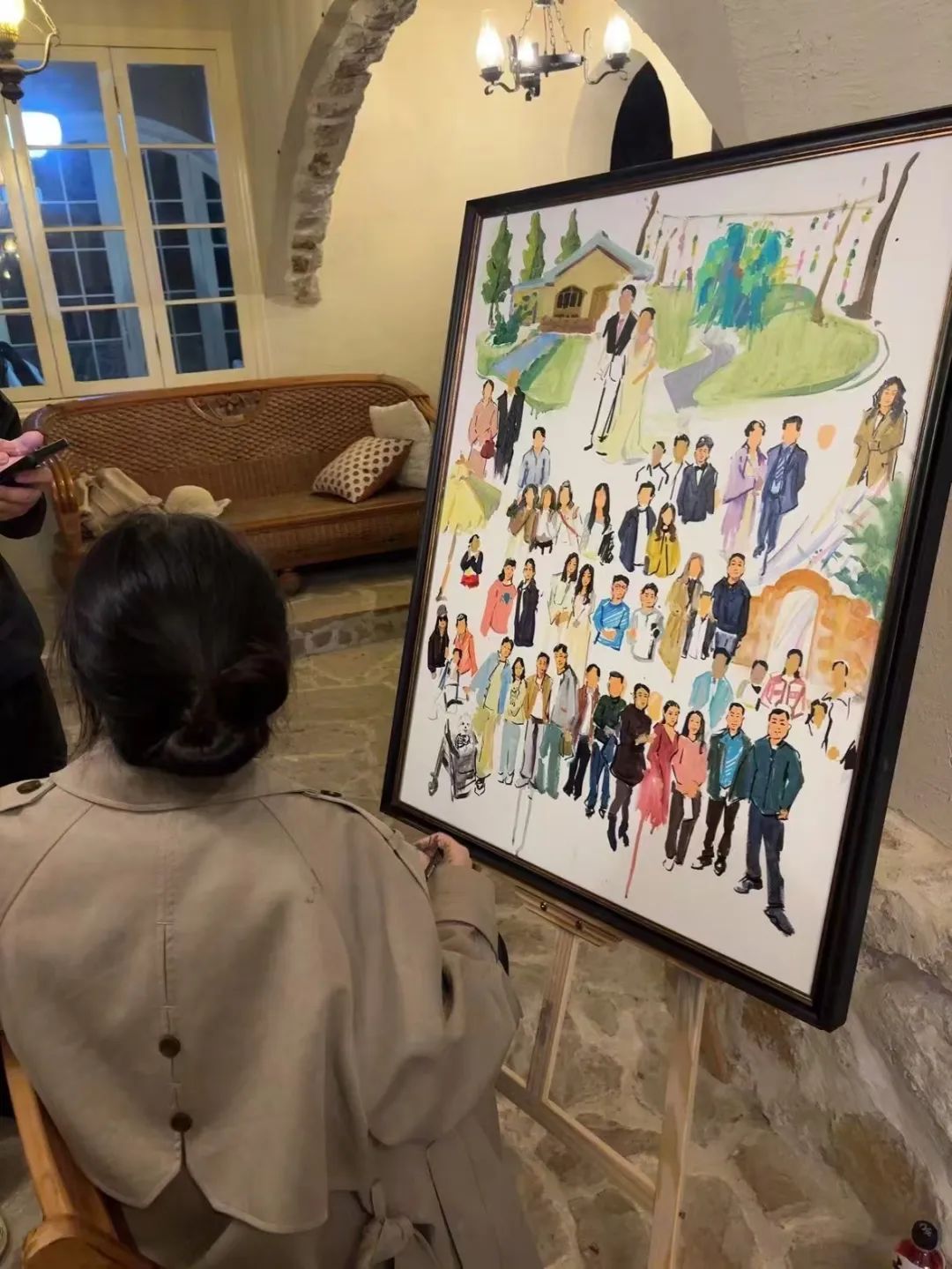 唯有事先进行绘画准备,待新人抵达后,依据现场的具体细节进行捕捉,方能创作出优秀的作品。例如,捕捉新人60余位亲朋好友在不同时间点的微妙表情,并在作品呈现后,让每位亲朋好友亲自签名;又如,将无法亲临婚礼现场的宠物也融入画作之中。