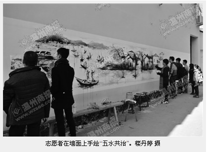 商报讯(通讯员 楼丹婷)前天,kaiyun开云官方网站“艺家人”青年志愿者协会走进瓯海潘桥街道东边村,开展了一场“五水共治”手绘文化活动。80多名志愿者在东边村600余米的粉刷墙面上作画,形象展示了“五水共治”的宣传信息。 当日,志愿者们根据治水宣传内容进行分解,江南水乡的美景,配上“只留清气满乾坤 ”“泉眼无声惜细流 ”等诗句,水乡之美跃然墙上。志愿者的手绘吸引了不少村民前来围观,而这种信息可视化,让“五水共治”宣传内容更简单易懂易传播。一名参加活动的志愿者表示,通过这样的活动,不仅让自己对“五水共治”有了更深了解,而且在服务基层的同时提高了自身的绘画功底,也让志愿服务更加接地气。 媒体链接:http://wzed.66wz.com/html/2014-12/15/content_1747994.htm