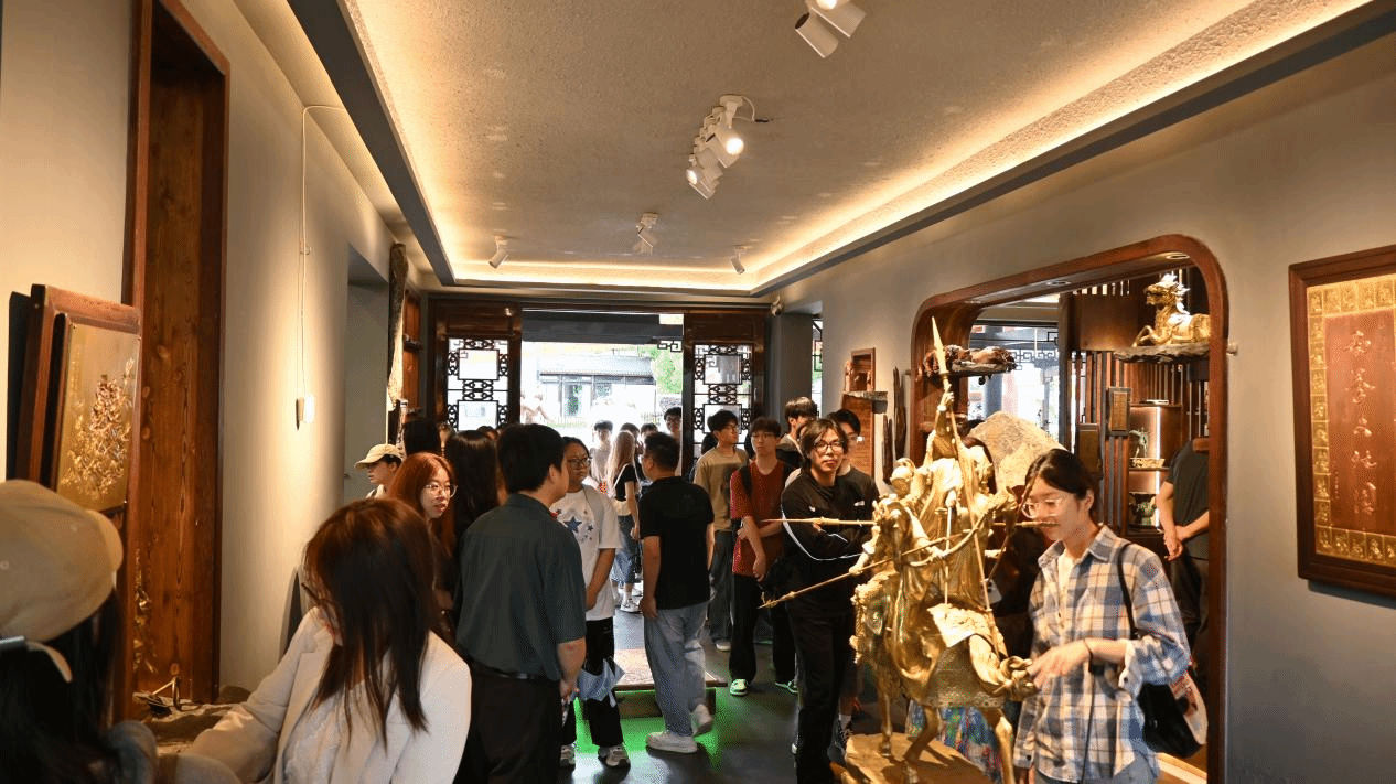 当日上午,学子们首站来到鸣山村。走进古朴的工坊,近距离感受铜板雕刻艺术。同学们参观着各式的铜刻雕塑,并被其细腻之处震撼。每一道工序都倾注着匠人的心血,精细的雕琢让金属的质感与匠人的巧思匠心相互交融,立体艺术之美尽显无遗。